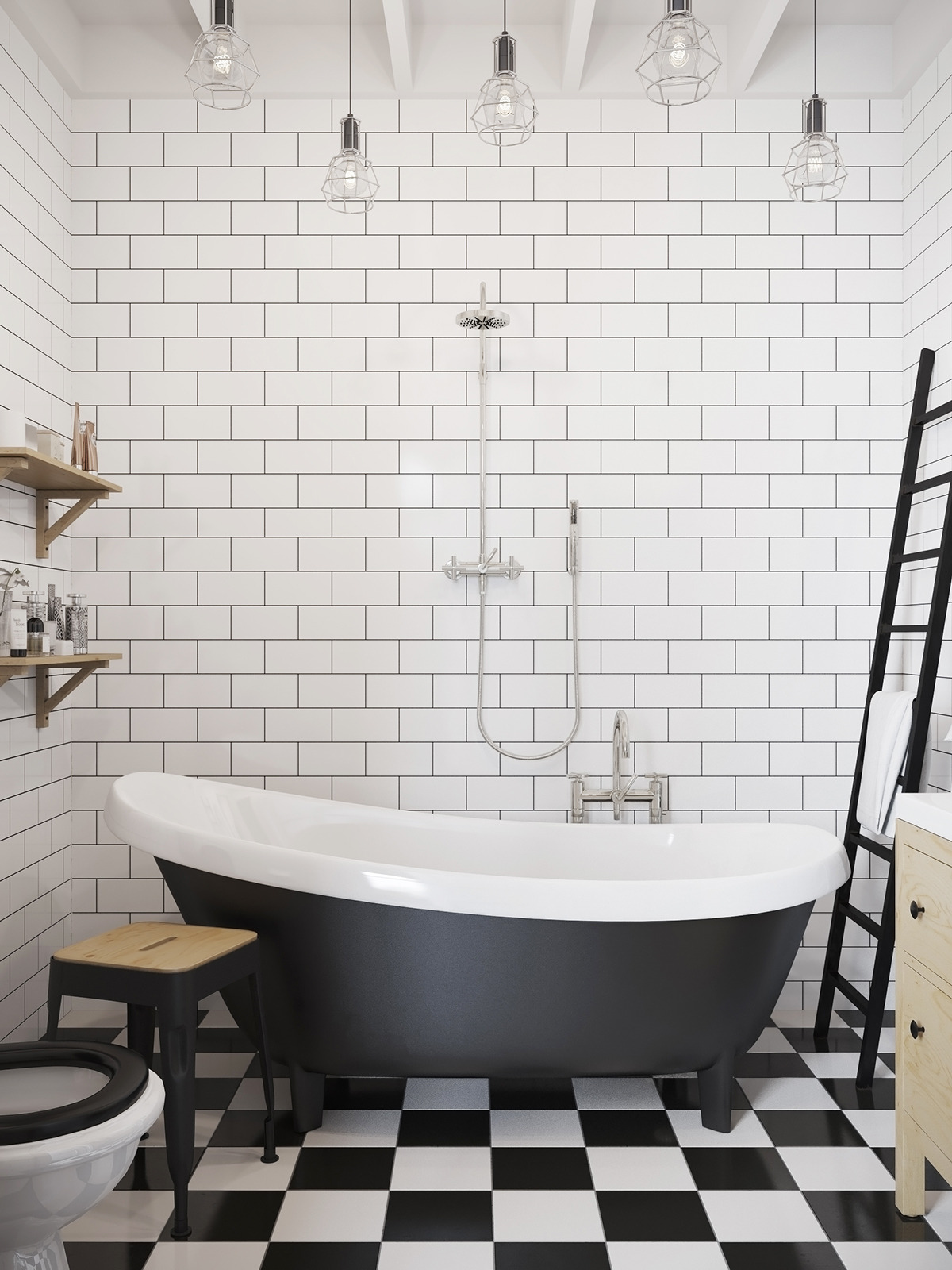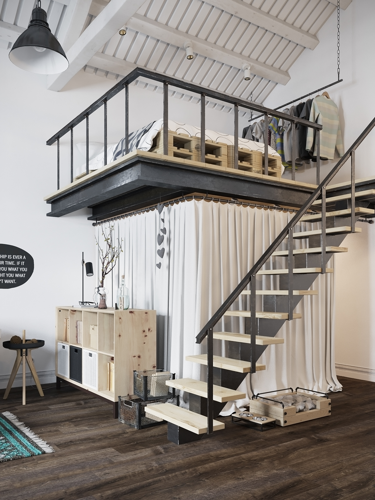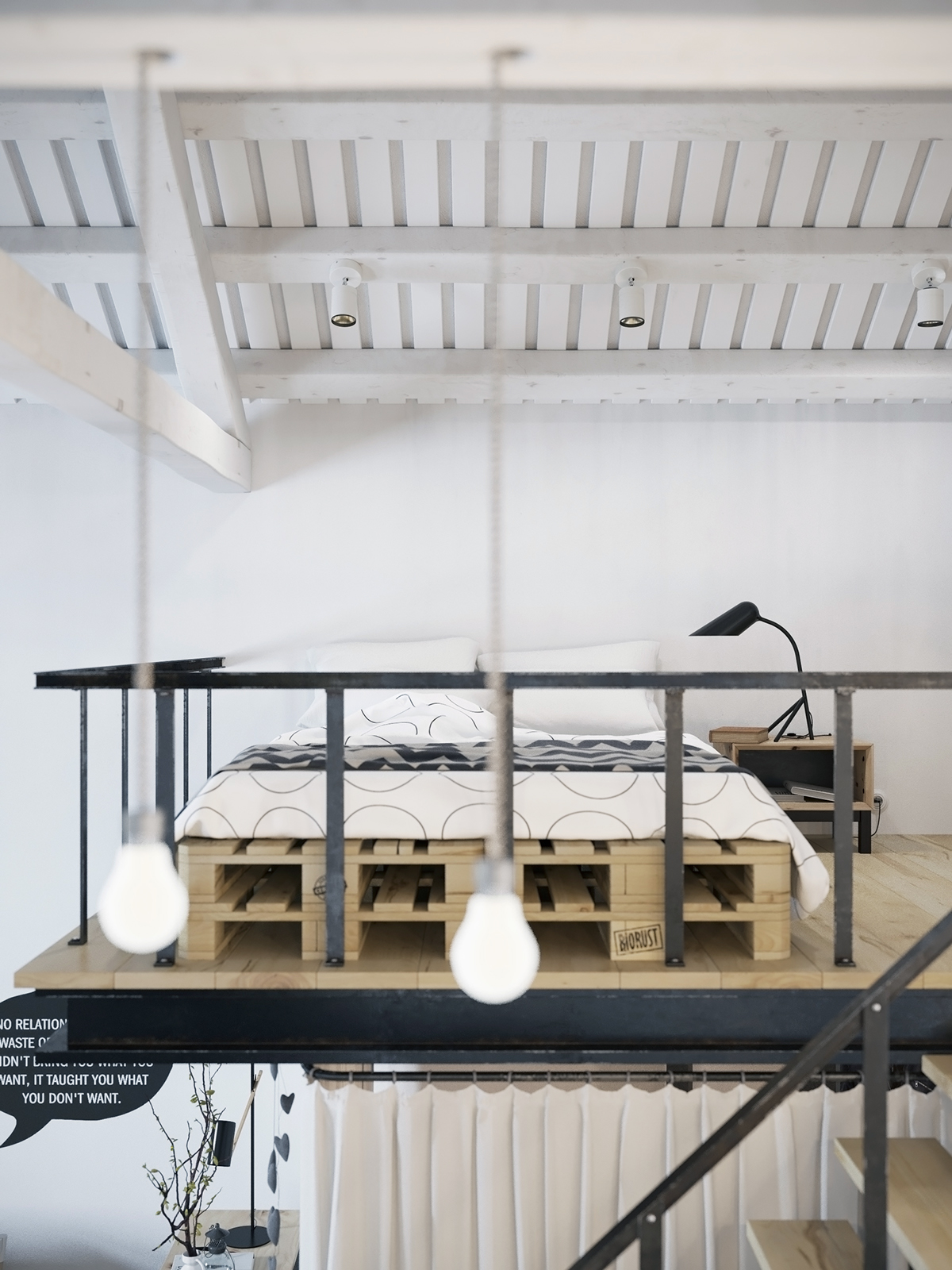 Леглото в зоната на втория етаж от лофта е семпло ултра уютно. Самото легло е направено от дървени палети. Банята е доста шик с тези бели тухли, а подът семпъл, но се долавя ретро стилът.