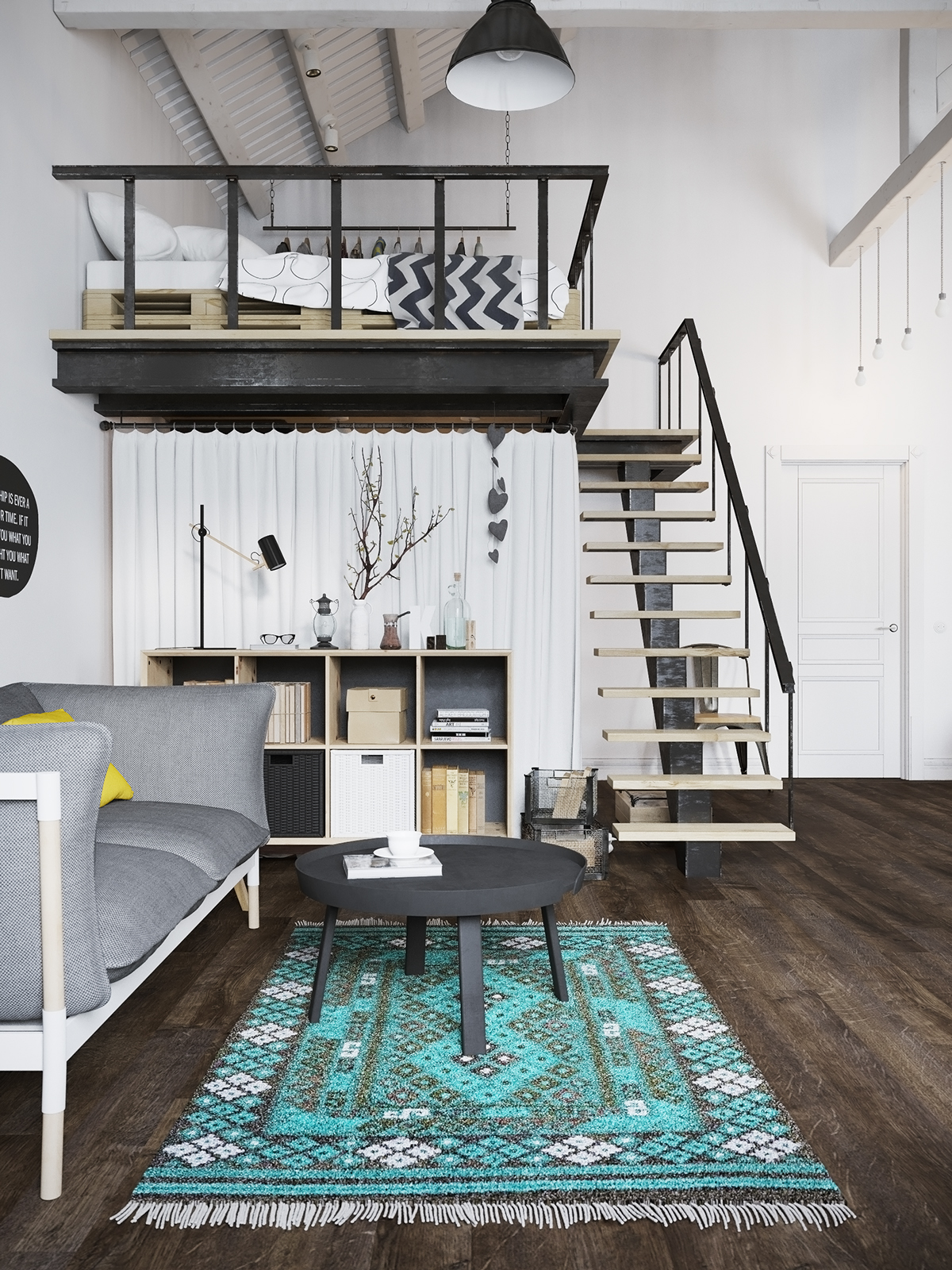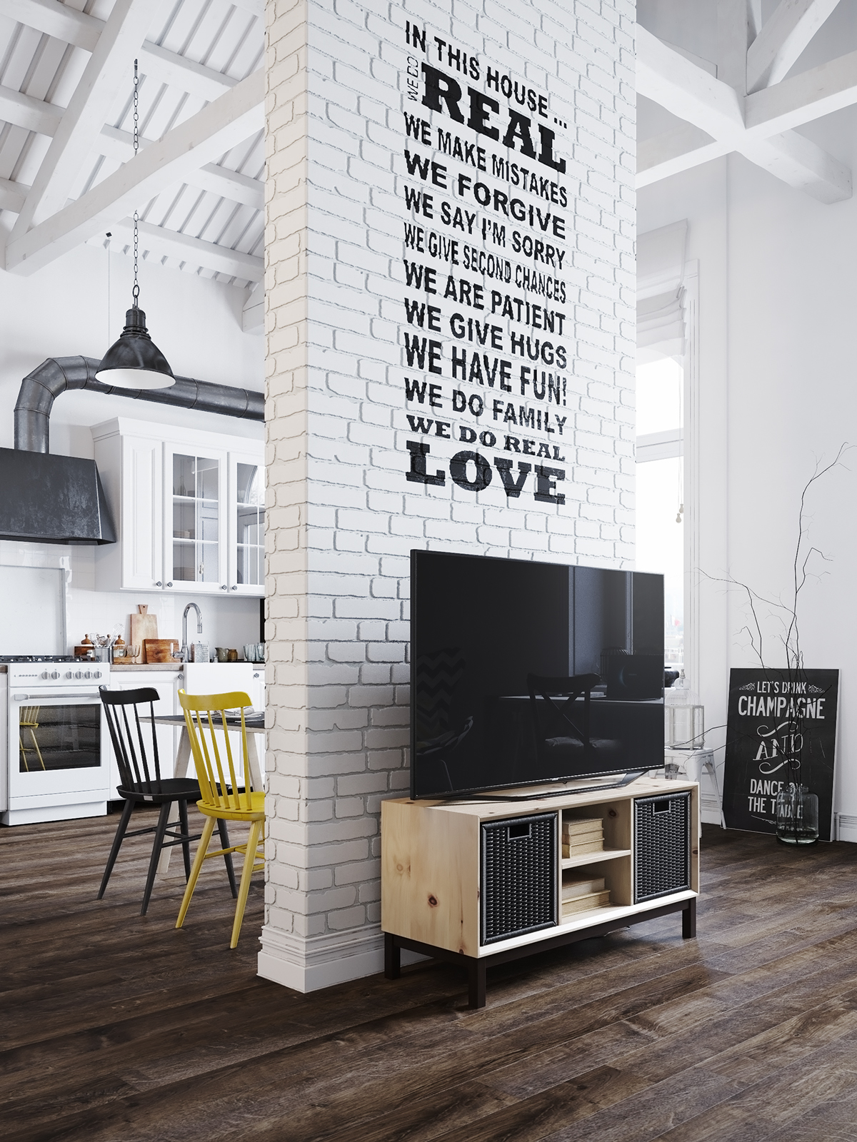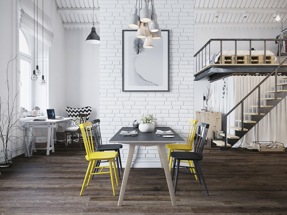 Пространството в дневната със сводестите тавани може да е малко страховито за някои от вас. Тук се въвежда цветовата палитра, чиито нишки си проправят път през останалата част на апартамента: ярки бели стени, тъмни дървени подове и от време на време искри в жълто или синьо зелено. Това е един много модерен и актуален дом. Централната тухлена стена е боядисана в бяло – тя служи като преградна стена в стаята.