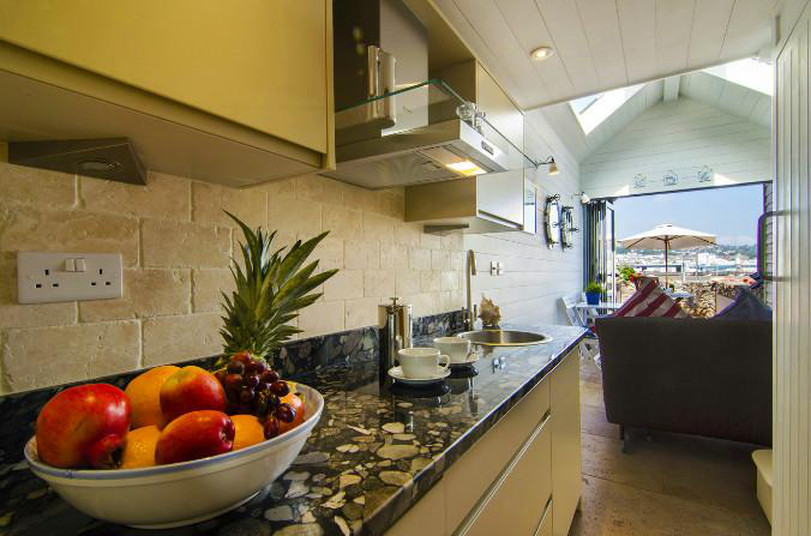 Превърнато в идеалното място за романтична почивка, това луксозно място предлага морска тематика и отворено оформление с мека мебел, маса за закуска и какво ли още не… Луксозната и добре оборудвана кухня кухня предоставя всички желани уреди за комфортен самостоятелен престой в комбинация микровълнова фурна, индукционен котлон и вграден хладилник, който се допълва от гранитен плот.