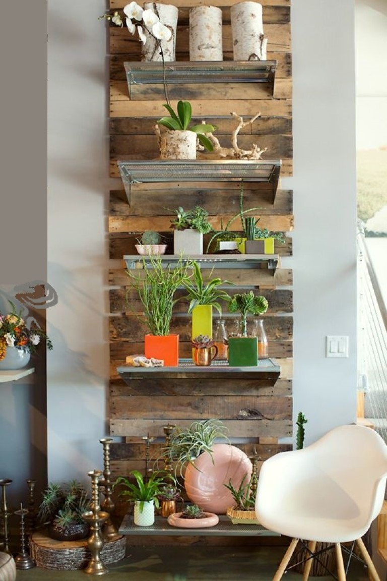 Само един единствен палет може да бъде окачен на стената в кухнята или върху леглото, за да добавите допълнително място за съхранение и стил. В случая нямате много работа за модифициране на оригиналния палет. Това е страхотен, ефективен и дори евтин вариант за съхранение на книги, бутилки и дрънкулки.