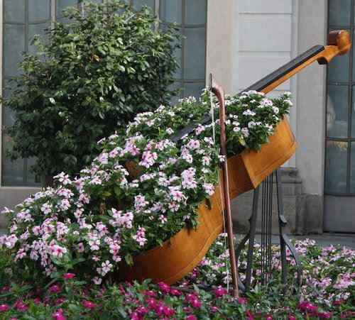 Използвайте стар струнен инструмент, за да декорирате градината си – за предпочитане е виола или чело, заради размерите им, но, разбира се, може да използвате и каквото имате под ръка. Напълнете инструмента с почва и засадете любимите си цветя вътре.