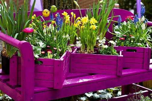Развеселете атмосферата в градината си като боядисате няколко кокетни щайги в ярък, любим Ваш цвят, поставете в тях саксии с красиви цветя и ги разположете на подходящото място в градината си.