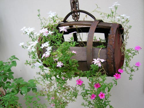 Използвайте старо буре, за да си направите страхотна декорация за градината; може да изрежете отвори в едната му част, да го напълните с почва, да засадите красиви растения или билки и да го закачите под навеса в градината или на някоя от стените на къщата си.