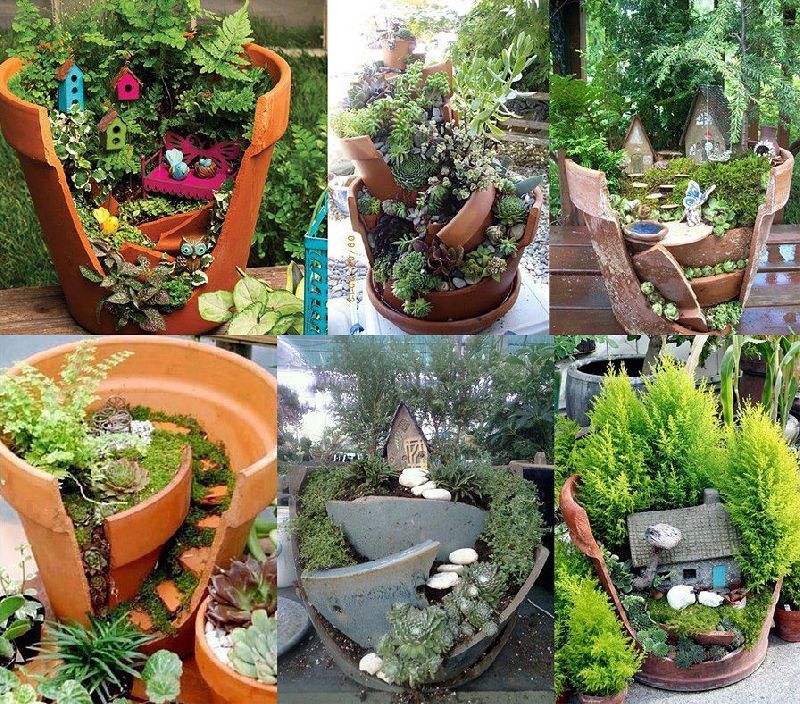На първо място, можете да използвате големите счупени скасии като сътворите миниатюрни градинки в тях; бихте могли просто да изкорените голямото растение, което някога сте отглеждали във вече счупената саксия, да го посадите на друго място и да използвате парчетата от счупената саксия, за да създадете малки стъпала, водещи към вашата миниатюрна градина, пълна с малки кактуси, цветя или други растения.