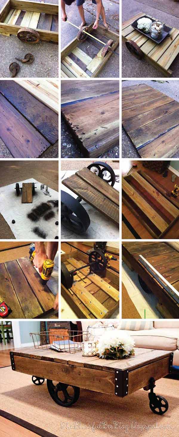 Тази холна масичка е изработена от стара количка за пренасяне на индустриални материали, като просто са и добавени допълнителни колелца и горна част изработена от дъски. Масичката изглежда изключително шик, тъй като съчетава стар винтидж стил с изчистения индустриален полъх.