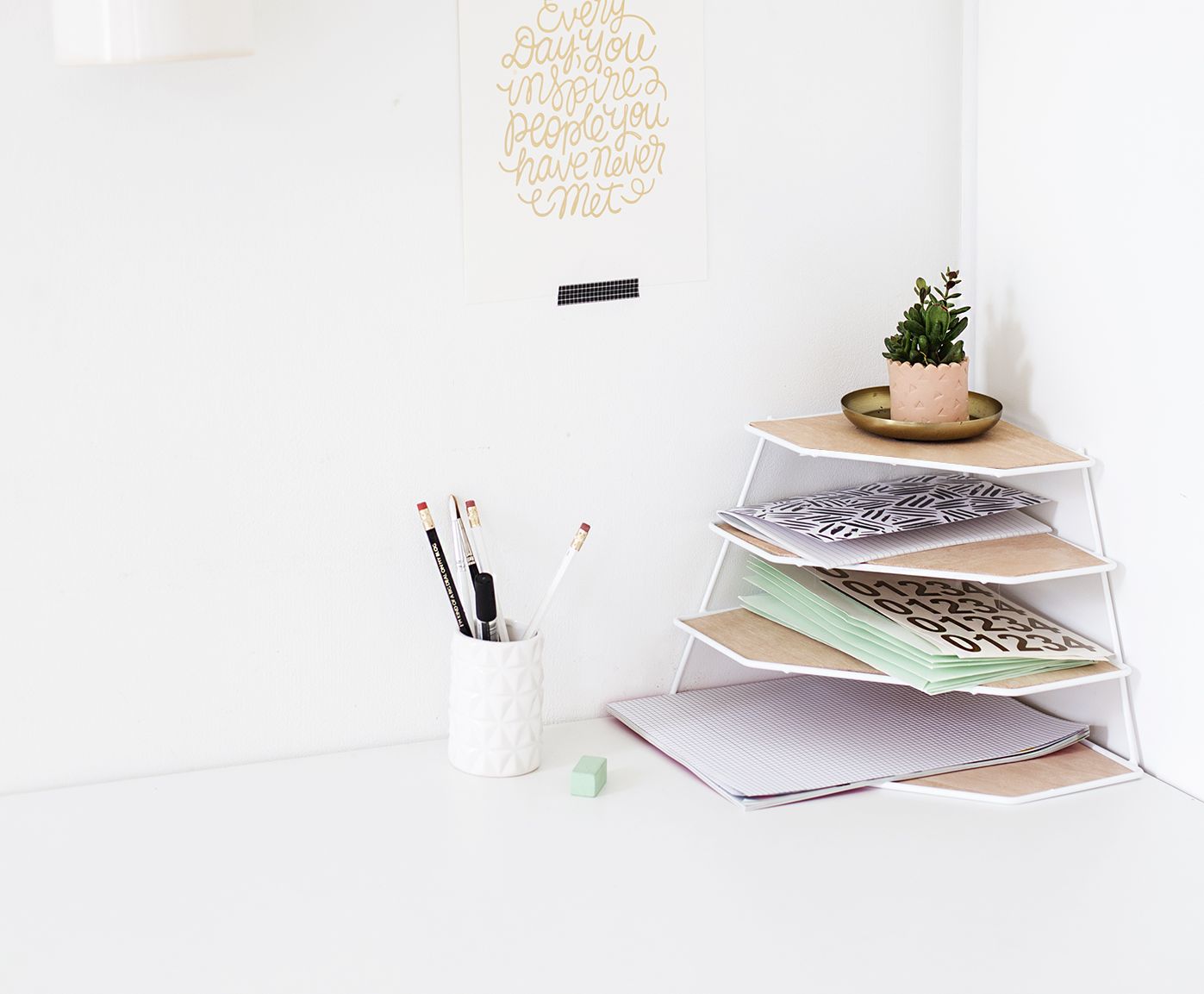 Перфектен за ъгъла на бюрото, този органайзер ви осигурява чиста работна повърхност и перфектна видимост към съдържанието си. Също така ви дава възможност да разнообразите строгостта на бюрото със снимка в рамка или малко стайно саксийно растение.