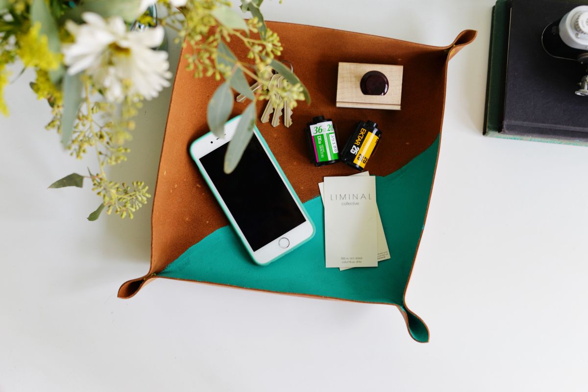 Друга идея е да измайсторите нещо като плитка купа или поднос, които да съхраняват личните ви вещи докато сте в офиса. Ето какво ви е нужно за направата: парче кожа, ножица, конец за бродиране, голяма игла за шиене, четка за боя и боя за платове. Използвайте какъвто цвят искате, можете дори да направите инициали или друг специален акцент.