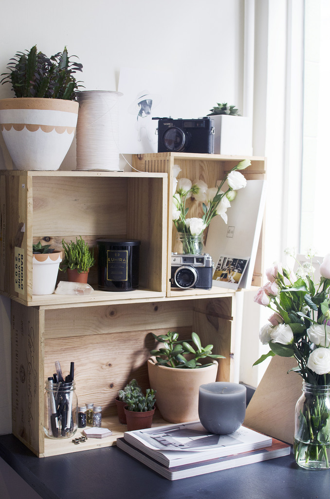 Когато се нуждаете от система за съхранение, винаги можете да разчитате на добрите стари дървени кутии, които да спасят положението. Те са толкова разнообразни, че можете да конструирате почти всичко с тяхна помощ, дори органайзер за бюро. Идеята е много семпла, може просто да поставите няколко кутии една върху друга и да ги използвате като лавици. Ако желаете можете да ги залепите една за друга или да ги захванете с пирони, така че инсталацията ви да не се разпада.