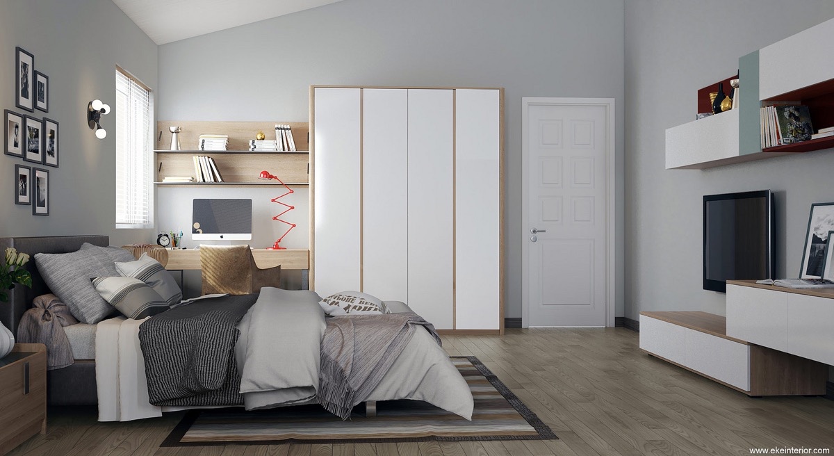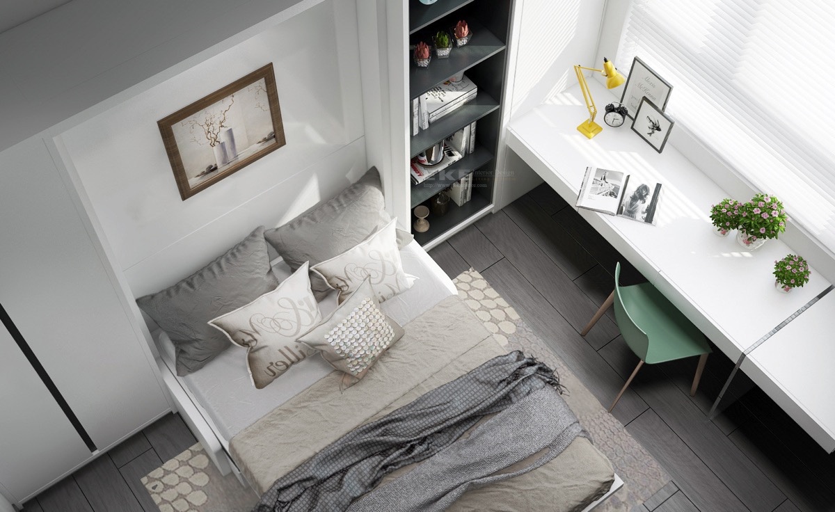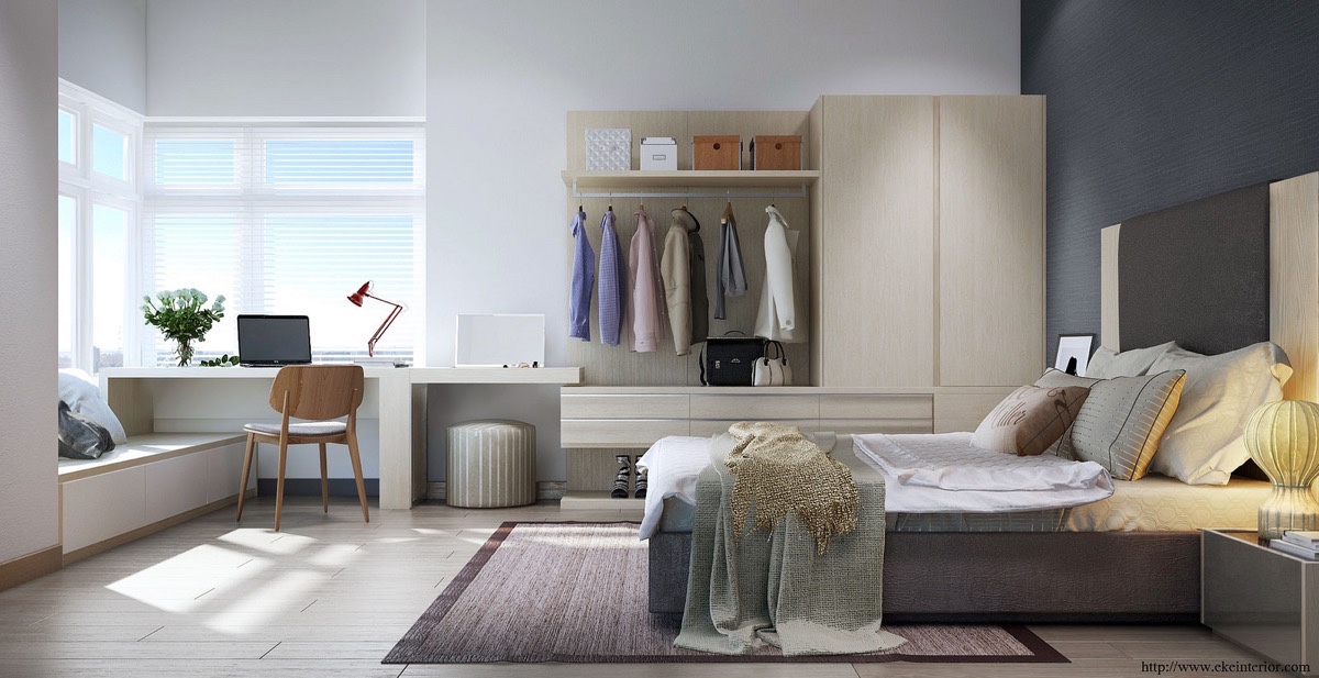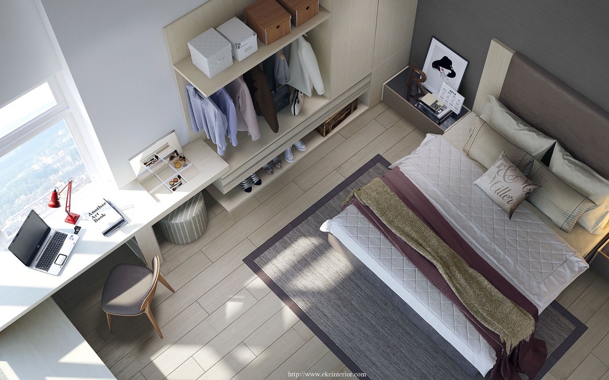 Съхранение, цвят и наслояване – всички са перфектни точки в тази спалня. Приглушените дървени елементи придават усещане за топлина, необходими във всяко неутрално пространство. Чекмеджетата се удвояват като създават възможност за сядане, а работната маса се обръща нагоре, за да разкрие скритото огледало. Тази спалня спестява тонове пространство със своите многофункционални мебели.