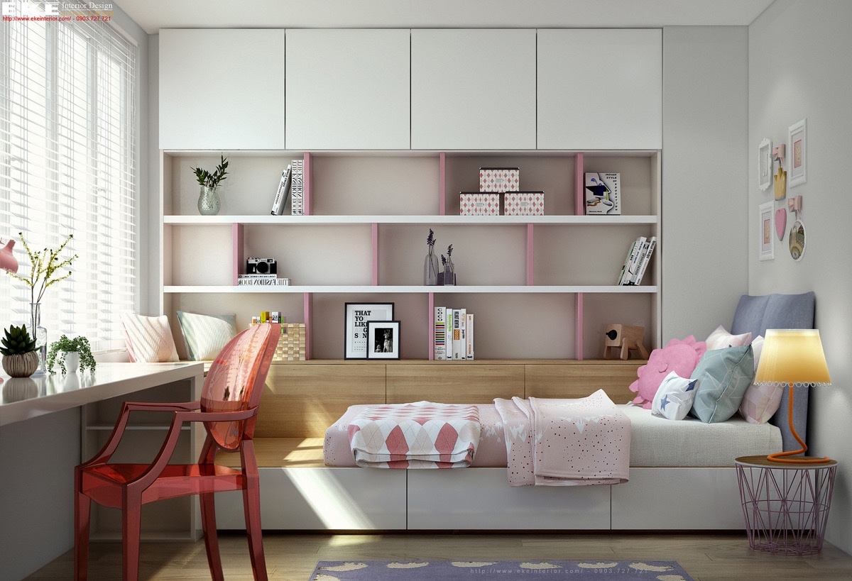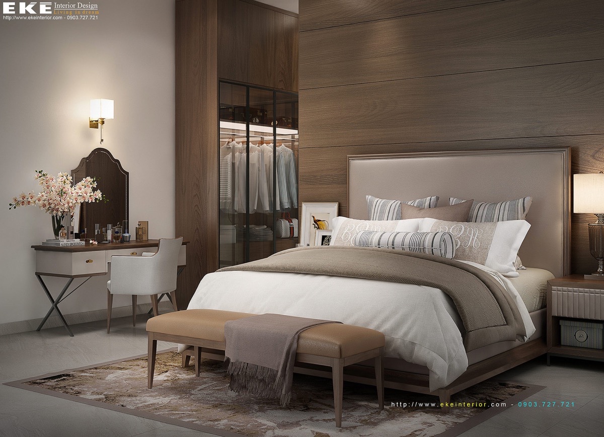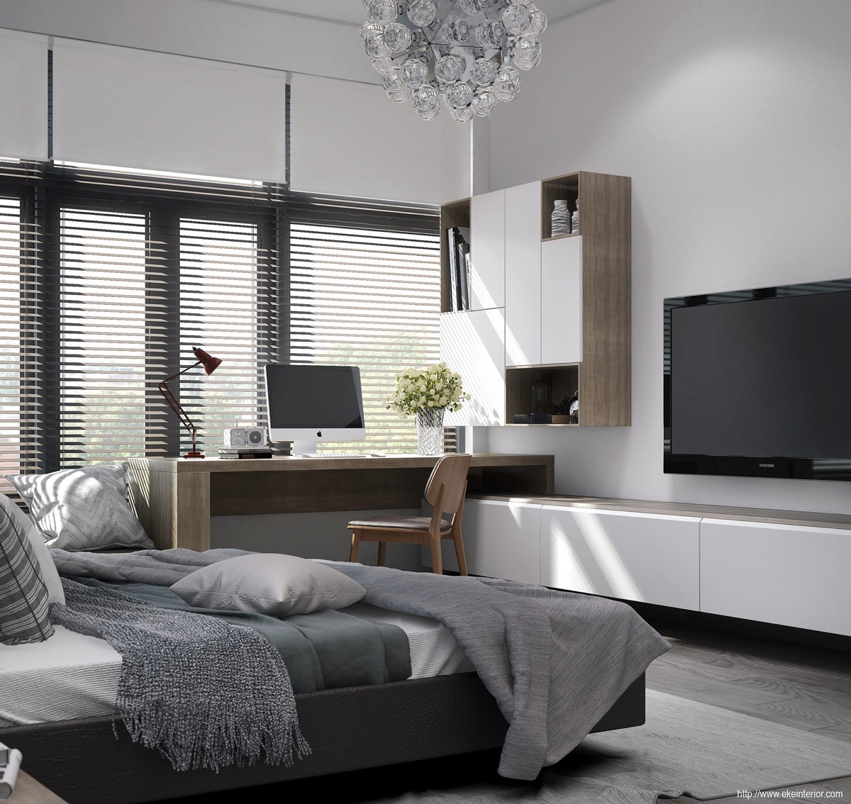 Съхранение, цвят и наслояване – всички са перфектни точки в тази спалня. Приглушените дървени елементи придават усещане за топлина, необходими във всяко неутрално пространство. Чекмеджетата се удвояват като създават възможност за сядане, а работната маса се обръща нагоре, за да разкрие скритото огледало. Тази спалня спестява тонове пространство със своите многофункционални мебели.