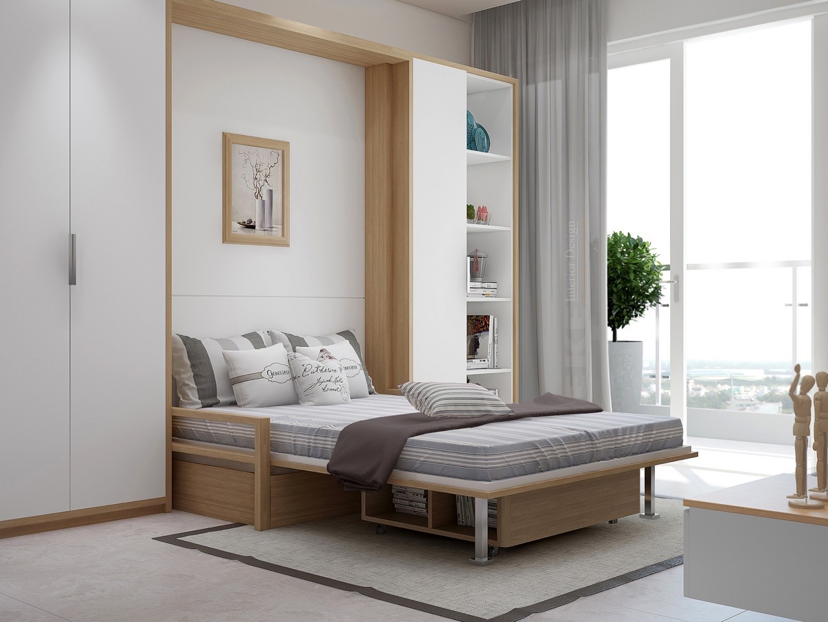 Моделът на леглата в повечето спални позволява да се спести място, особено в апартамент тип студио. Това се превръща в диван с атрактивни стелажи.