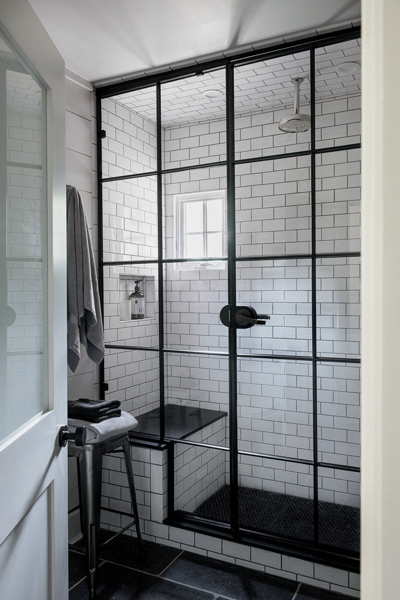 В този душ има дори нещо поетично. Отчасти се дължи на черната рамка и начина по който тя контрастира на белите плочки, но също така и заради това малко, квадратно прозорче и вградената ниша над пейката.