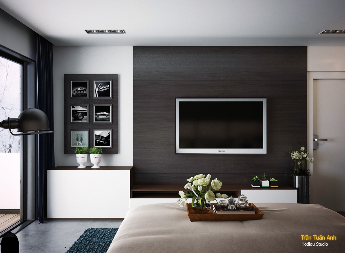 черните капаци на гардероба осигуряват така желания контраст в стаята.
