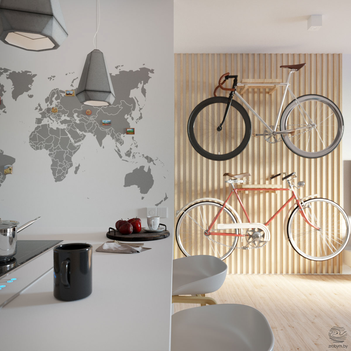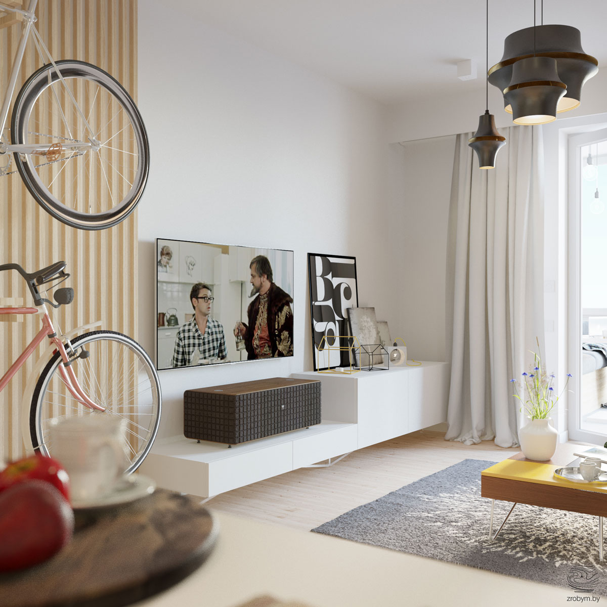Да окачите колелото си на стена у дома е едновременно практично пространствено решение и изненадващ декоративен елемент. Тук те са намерили централно място до телевизора, захванати за декоративна дървена решетка на стената. Лампиона също е интересен елемент в това пространство и краси тавана по особено запомнящ се начин, изцяло метален и в различни форми, той приковава вниманието. Дискретната бяла секция на две нива е идеална за аудио уредба и декоративни елементи.