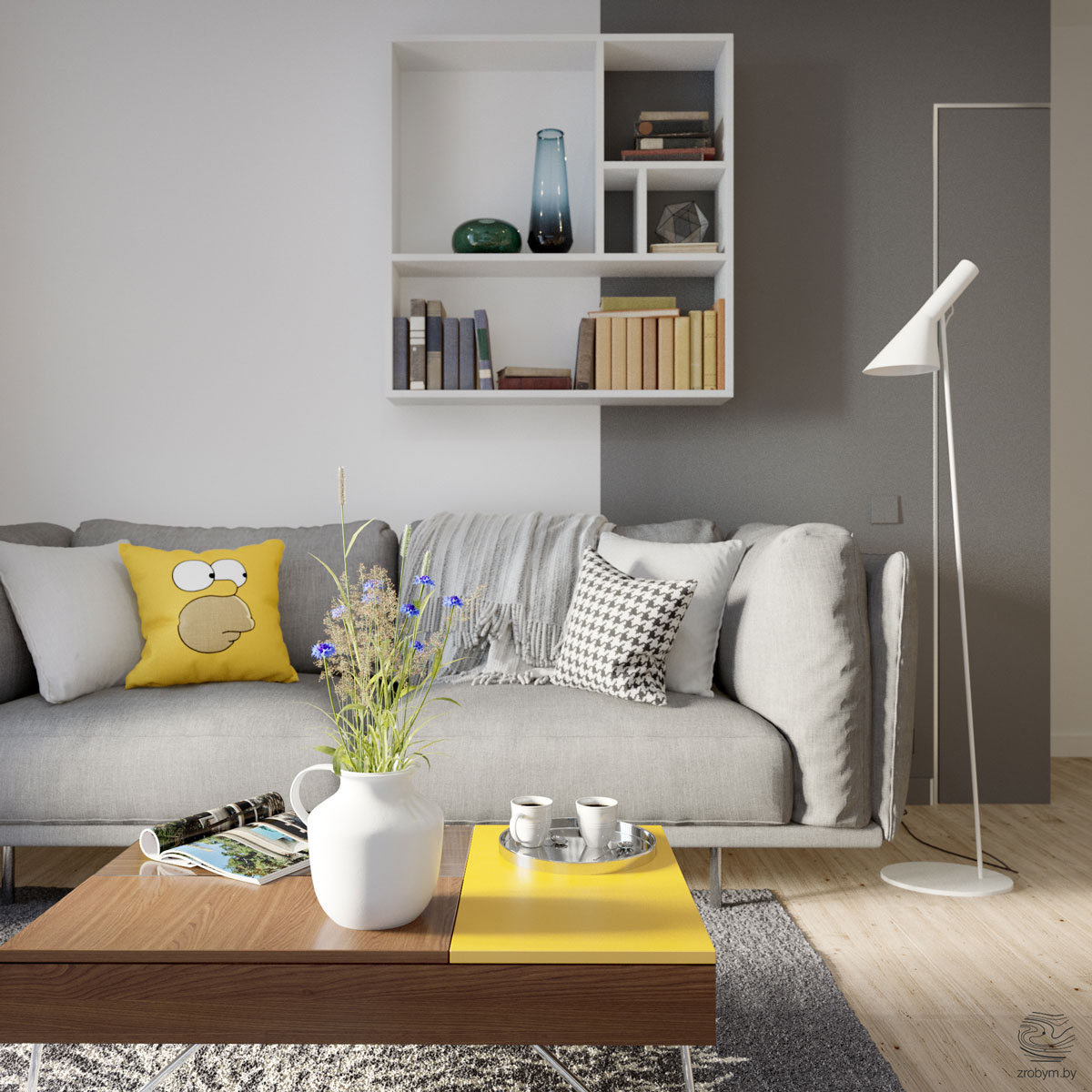 Закачливият дизайн на декоративната възглавничка, с мотив от сем. Симпсън върху дивана озарява дизайна на всекидневната. Тя може да бъде обърната с лицето към облегалката, за да получите по-семпъл дизайн. Аранжировката от полски цветя в декоративната ваза оживяват масичката за кафе, а семплите бели съдове допълват семплото излъчване на декора.