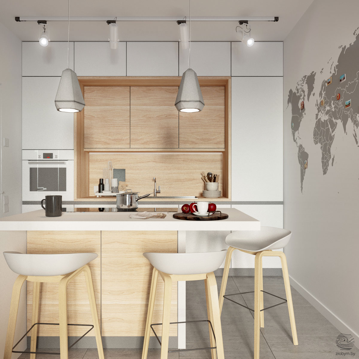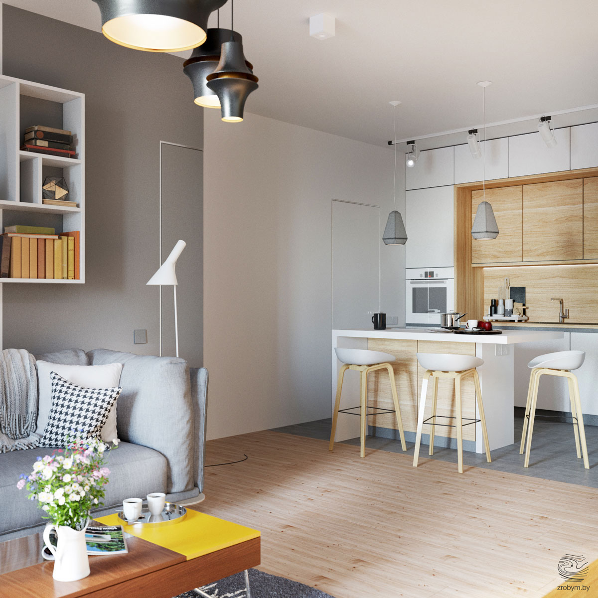 А този малък апартамент пък е с изцяло отворен пространствен план и всекидневната прелива към кухненската площ, която е обособена с промяна на подовата настилка. Всяка ниша използва едни и същи цветови решения и цветни комбинации от бяло, дървесни тонове, меко сиво и жълто. Това помага на апартамента да остане едно хомогенно, изчистено пространство в целостта си.