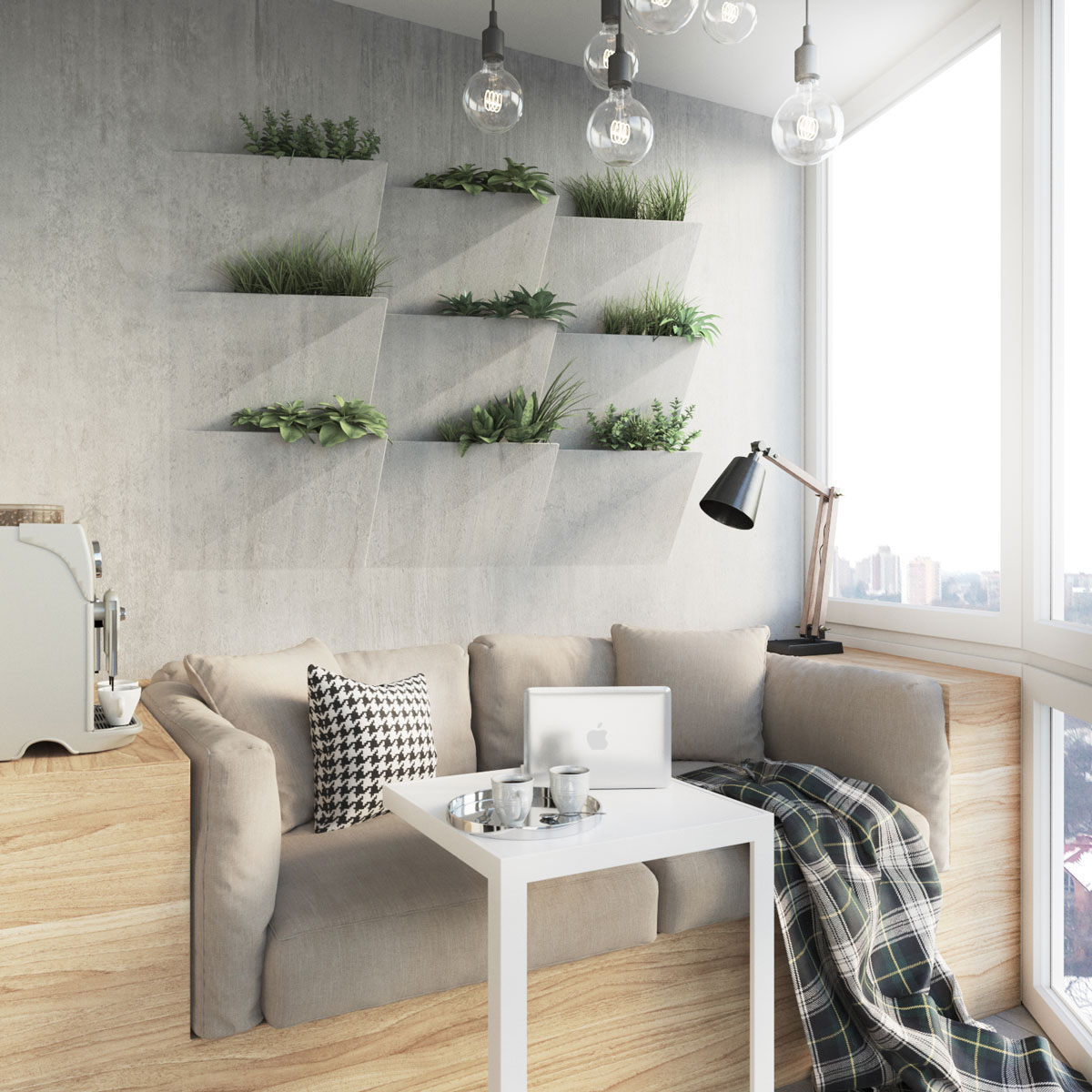 А този малък апартамент пък е с изцяло отворен пространствен план и всекидневната прелива към кухненската площ, която е обособена с промяна на подовата настилка. Всяка ниша използва едни и същи цветови решения и цветни комбинации от бяло, дървесни тонове, меко сиво и жълто. Това помага на апартамента да остане едно хомогенно, изчистено пространство в целостта си.