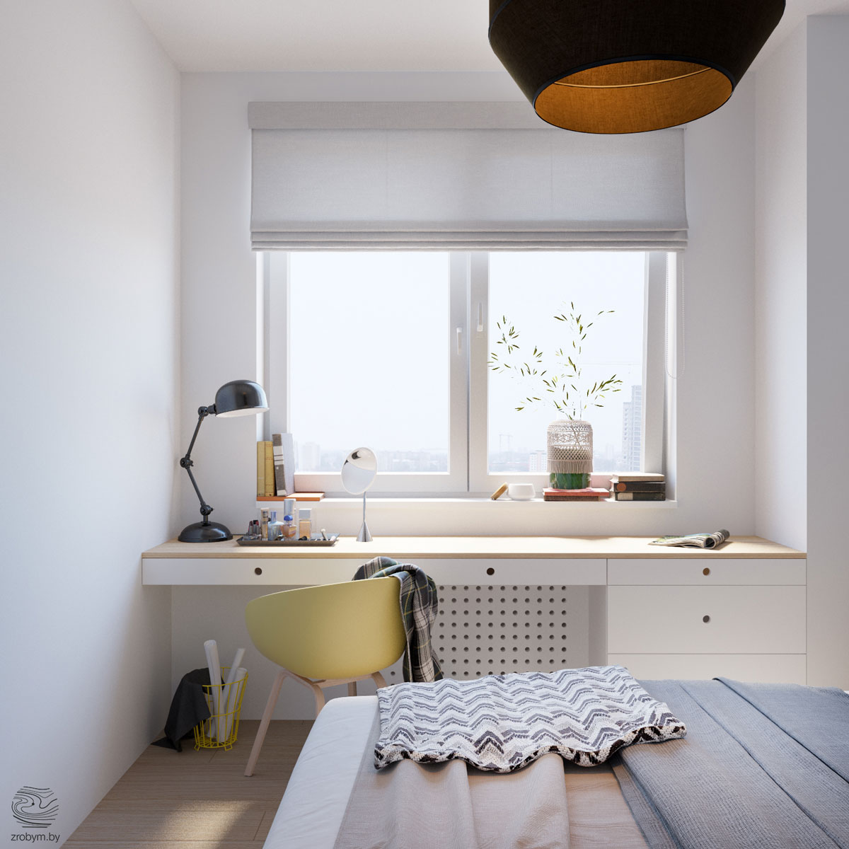 Днес правим обиколка на два малки апартаменти тип студио! Реконструкцията на първия малък апартамент, ситуиран в Минск и дело на интериорният дизайнер Zrobym, ни доказва, че малките апартаменти, не само че не е задължително да бъдат претъпкани, но и съвсем не е задължително да са лишени от простор. Тук той е постигнат чрез елегантни цветови решения. Дизайнерът се е спрял на жълтият цвят като обединяващ елемент, минаващ през всички помещения по невероятно деликатен начин, без да оставя дори съмнение за натрапчивост или да превзема така или иначе малкото пространство. Веселите акценти създават интригуваща спънка за окото докато се плъзга из интериора. Стената също е оползотворена до максимум, стенните рафтове са изключително деликатни и предлагат функционалност без да претъпкват пространството.