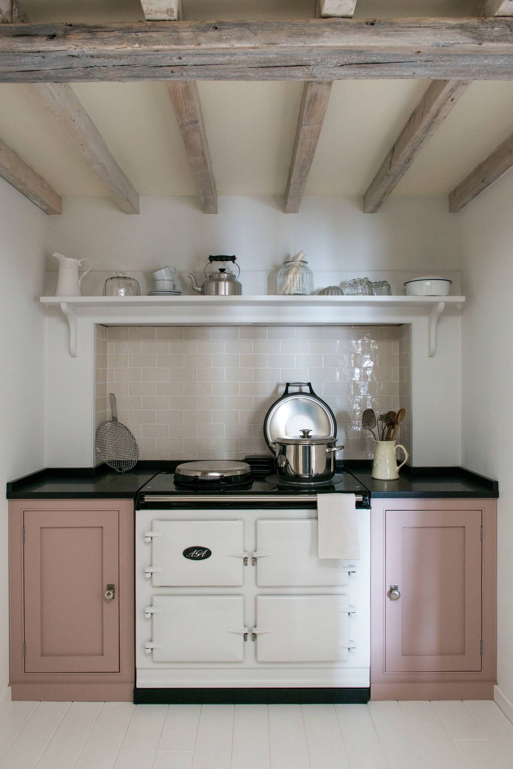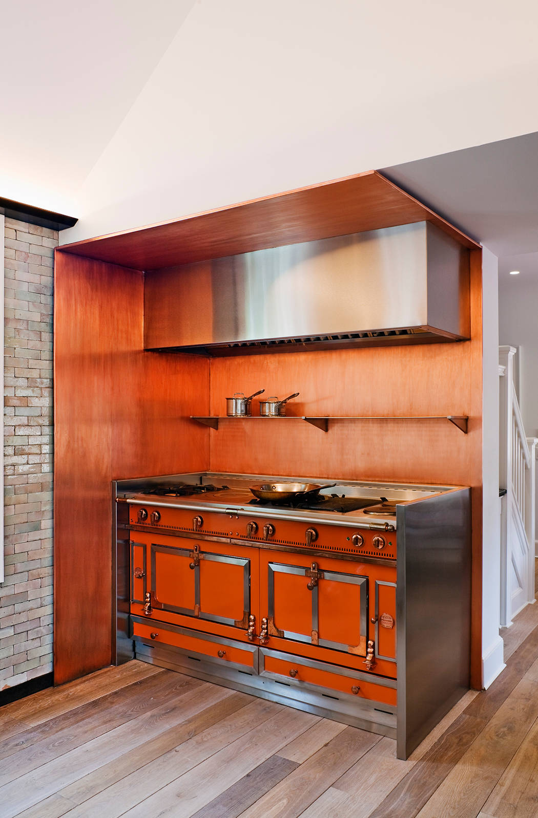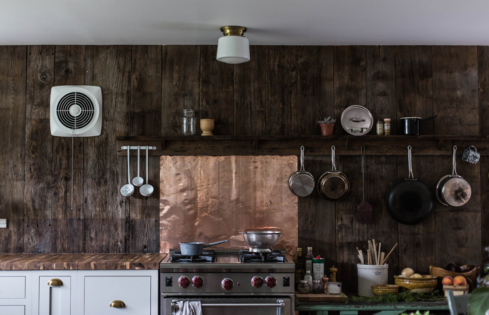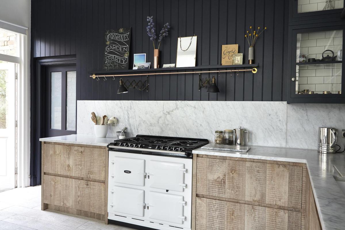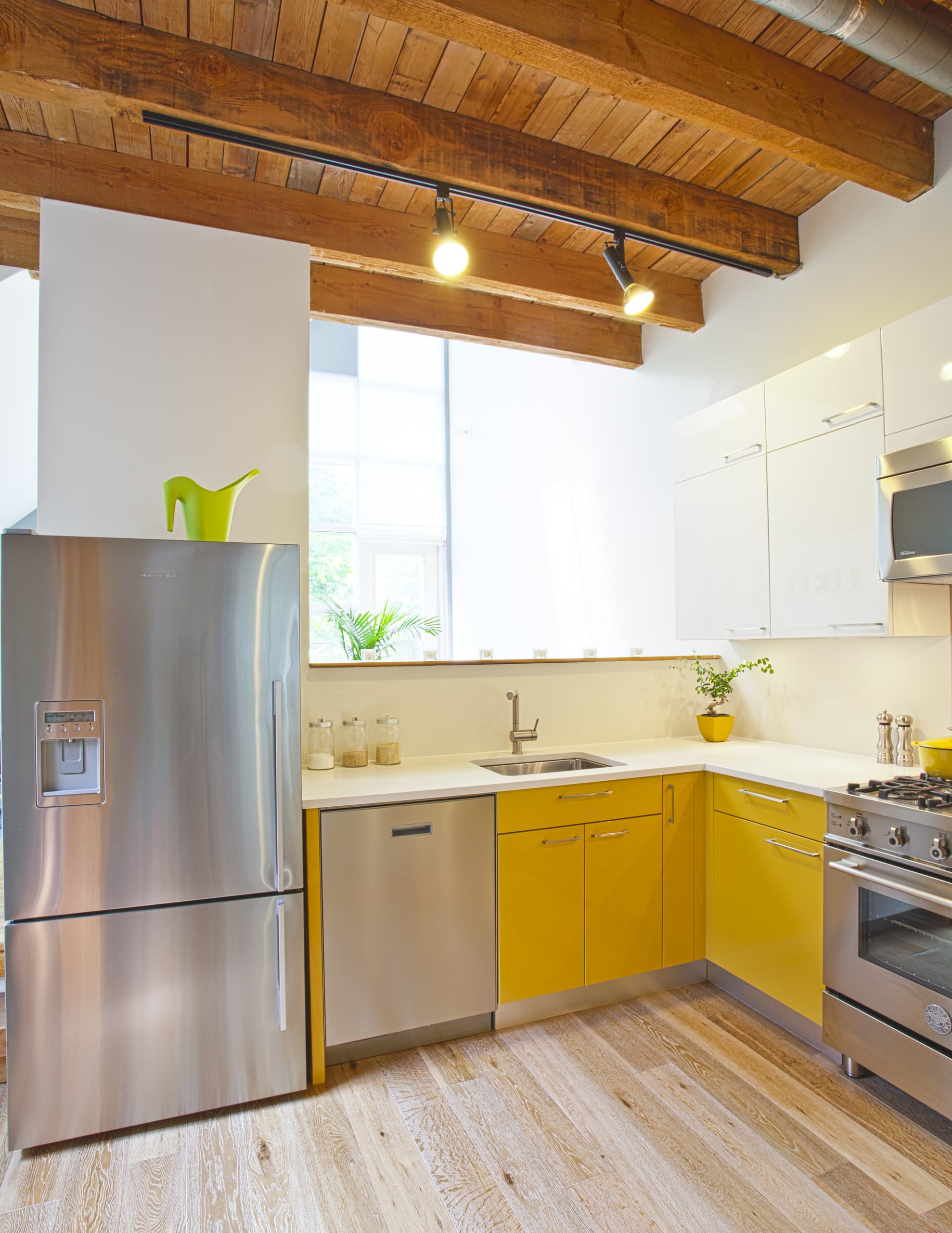 “Ла Шед” получават комплименти за този семпъл дизайн в бяло. Фокусиран върху простотата, това е отличен пример за кореспонденция и допълване между естесвените цветове без по-ярък цветови акцент. Разбира се, ако вие желаете, добавете цветен акцент, като ярко жълтата готварска печка, която са подбрали за тази кухня в естесвени нюанси. Тя перфектно контрастира с тъмните шкафове и белите стени, грее сякаш е самата усмивка на кухнята.