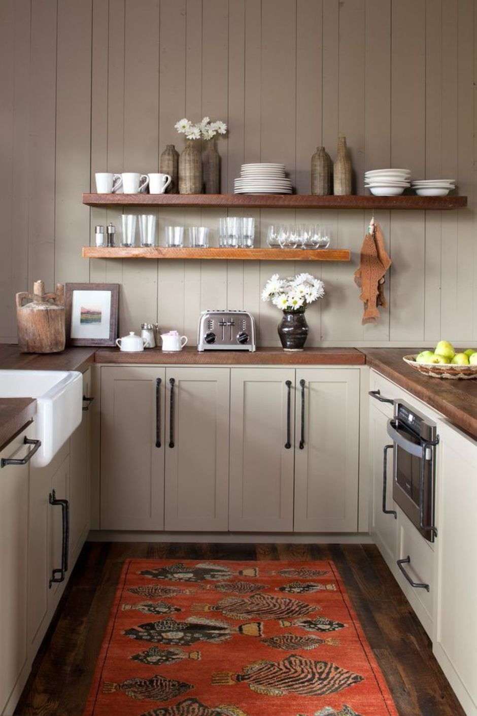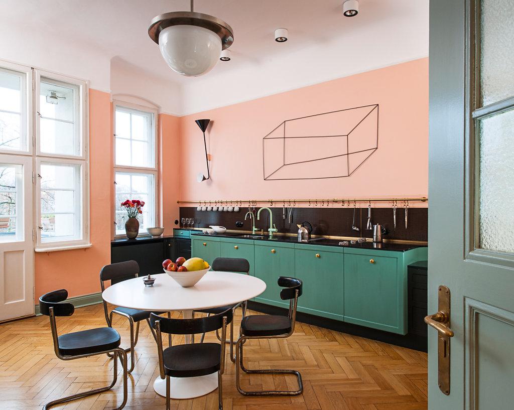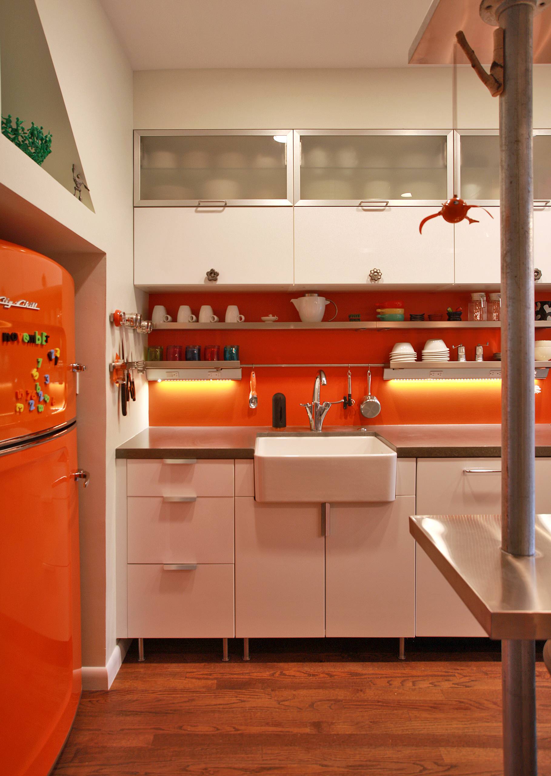 Ако пък имате вградени шкафове, които заемат една от кухненските ви стени, не бива да се отчайвате изобщо! В тази кухня от “Модула туенти” виждаме решение на проблема. Лицето на кухненските шкафове е решено в буреносно сиво, с което ги прави далеч по-приветливи, но не и по-обикновени. По начало сивото е пастелно черно, така че е добра идея да се доверите на пастелната гама в кухнята като цяло. Обицовка в светло пастелно зелено зад работният плот и мивката е доста успокояващ акцент, а можете да се доверите и на преливащо светло синьо или дори модното – розово. Каквото и да решите, ще изглежда чудесно на сивите ви стени. Сивото обаче, е чиста покана за цветни акценти! Ако все пак сивото ви идва в повече, възползвайте се от идеите на “Хепи Суидиш Китчън” и боядисайте кухненските шкафове в ярък цвят, за да контрастират на тъмните стени.