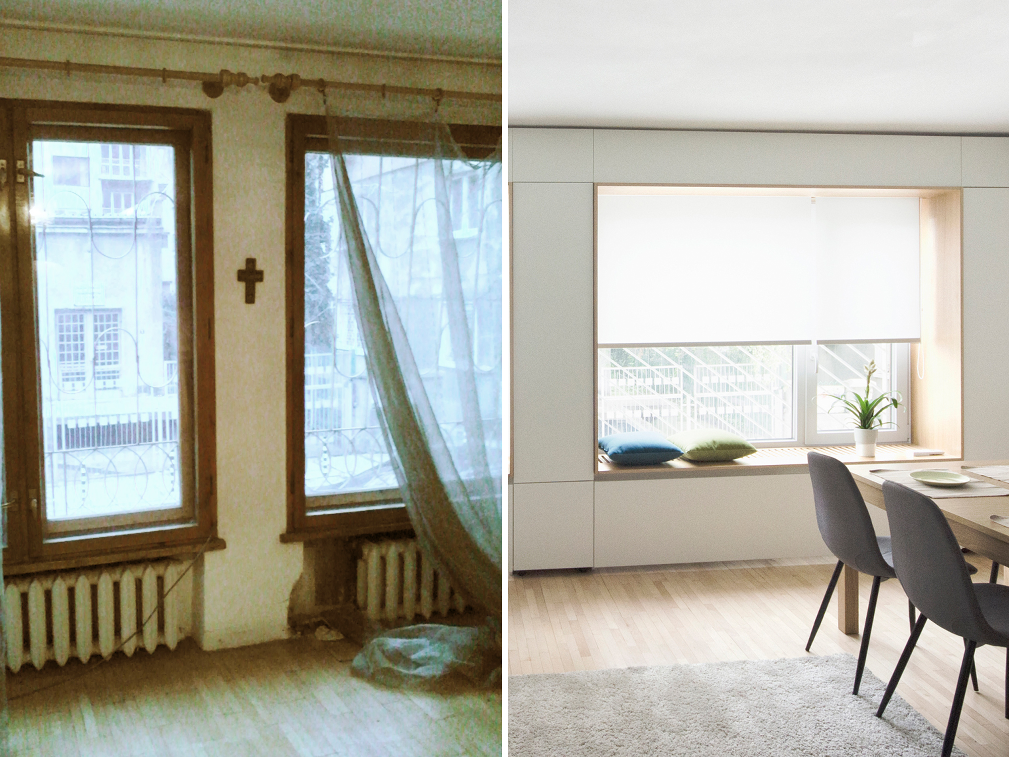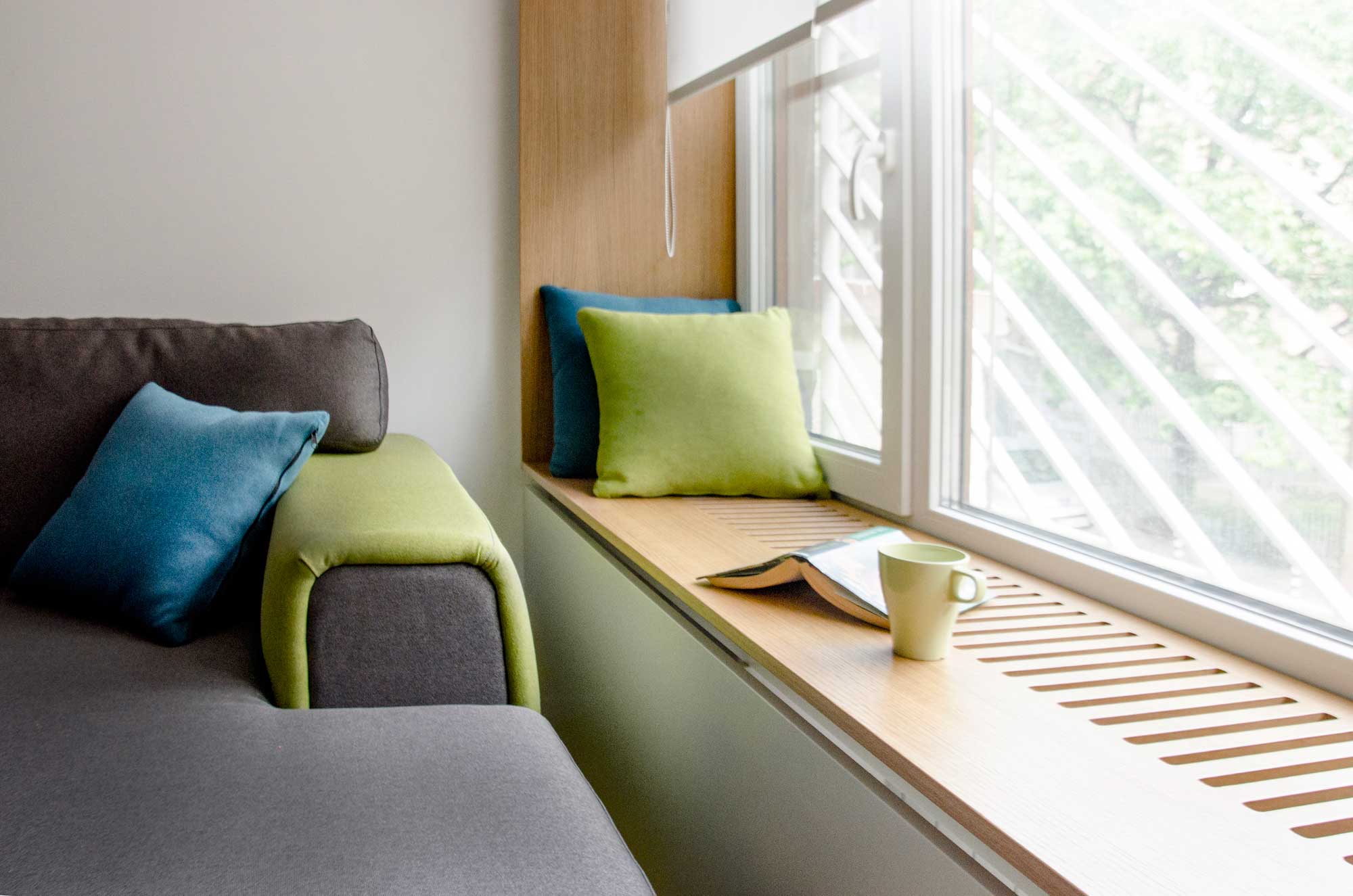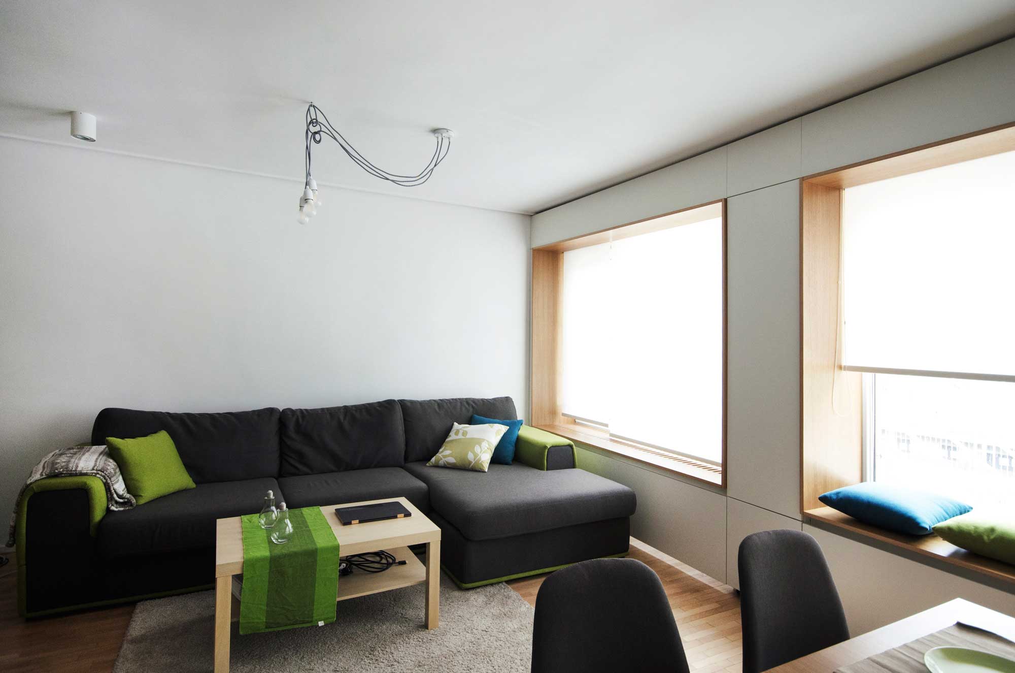 Прозорците печелят вниманието ни веднага – неуютната гледка навън, както и ниския парапет, предизвикали да се случи нещо предразполагащо и привлекателно. Предвидена е стена от шкафове, която да обрамчи прозорците, образувайки две уютни ниши за сядане – за четене или за гости, за които трапезарните столове не са достатъчни. Така другото изискване на собствениците е удовлетворено – да може да се играят поне две бордови игри едновременно. В шкафа са вградени също така радиаторите и щорите, което придава минимален и изчистен вид на пространството. Останало и много място за съхранение на вещи.