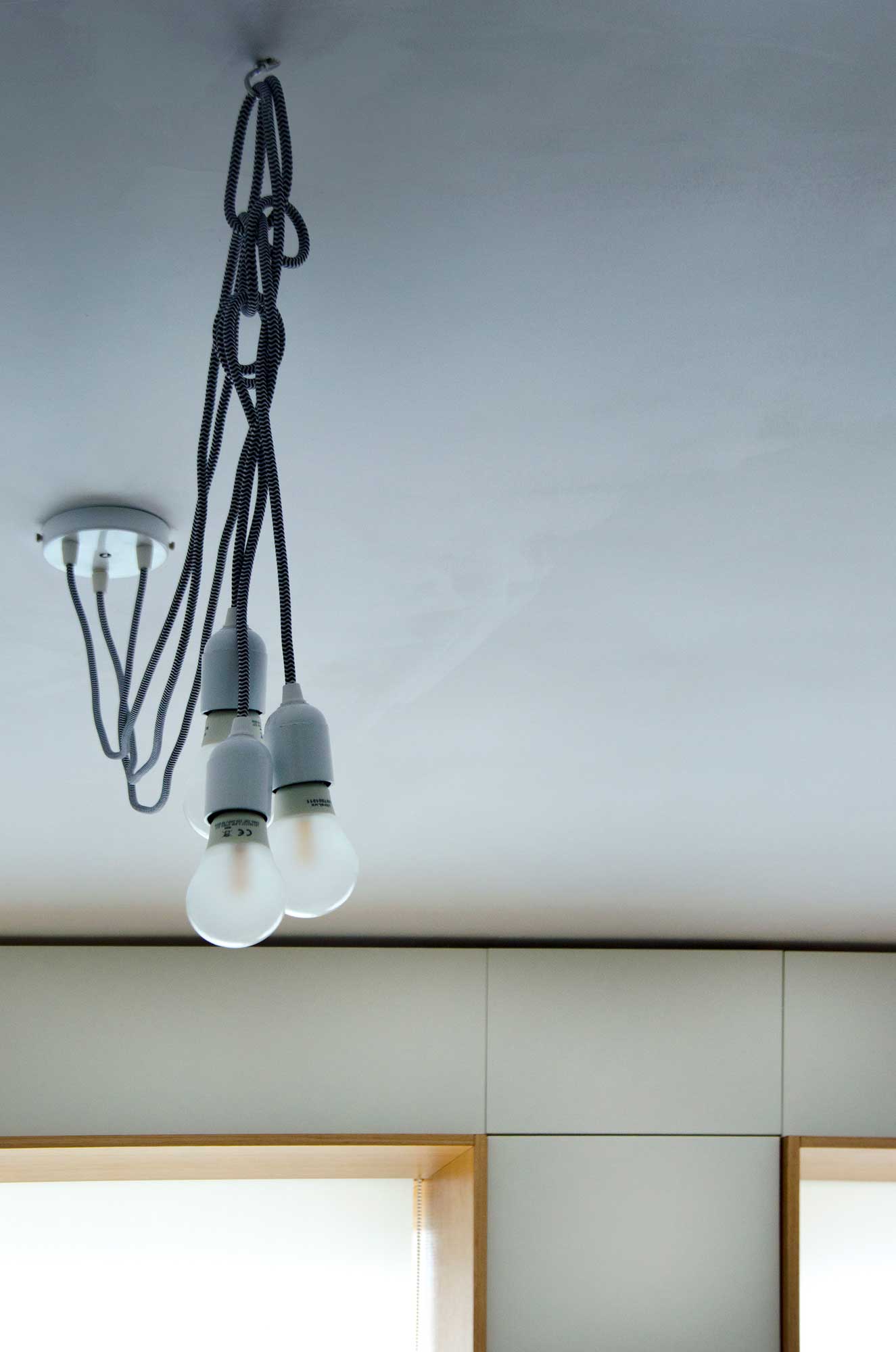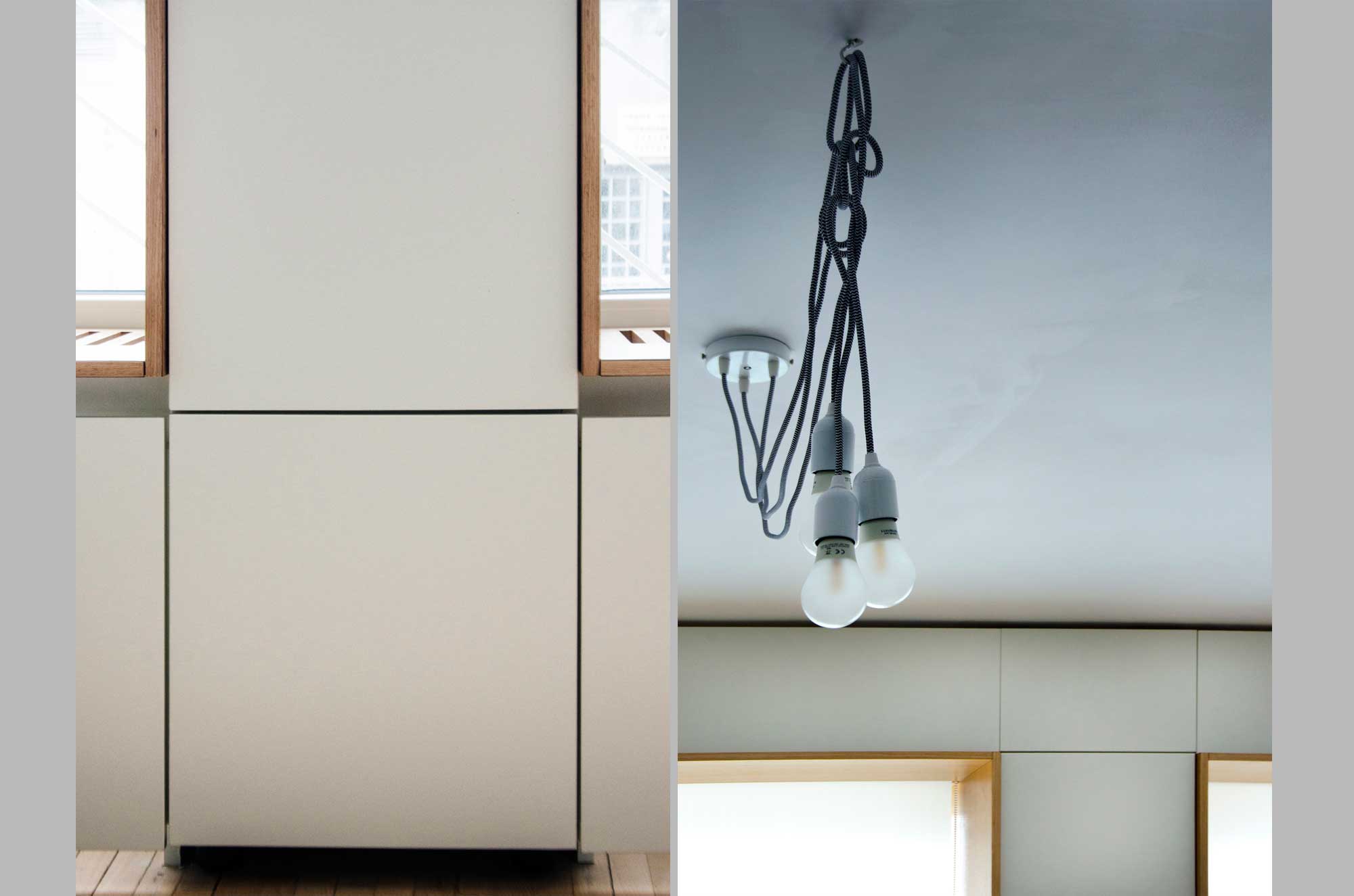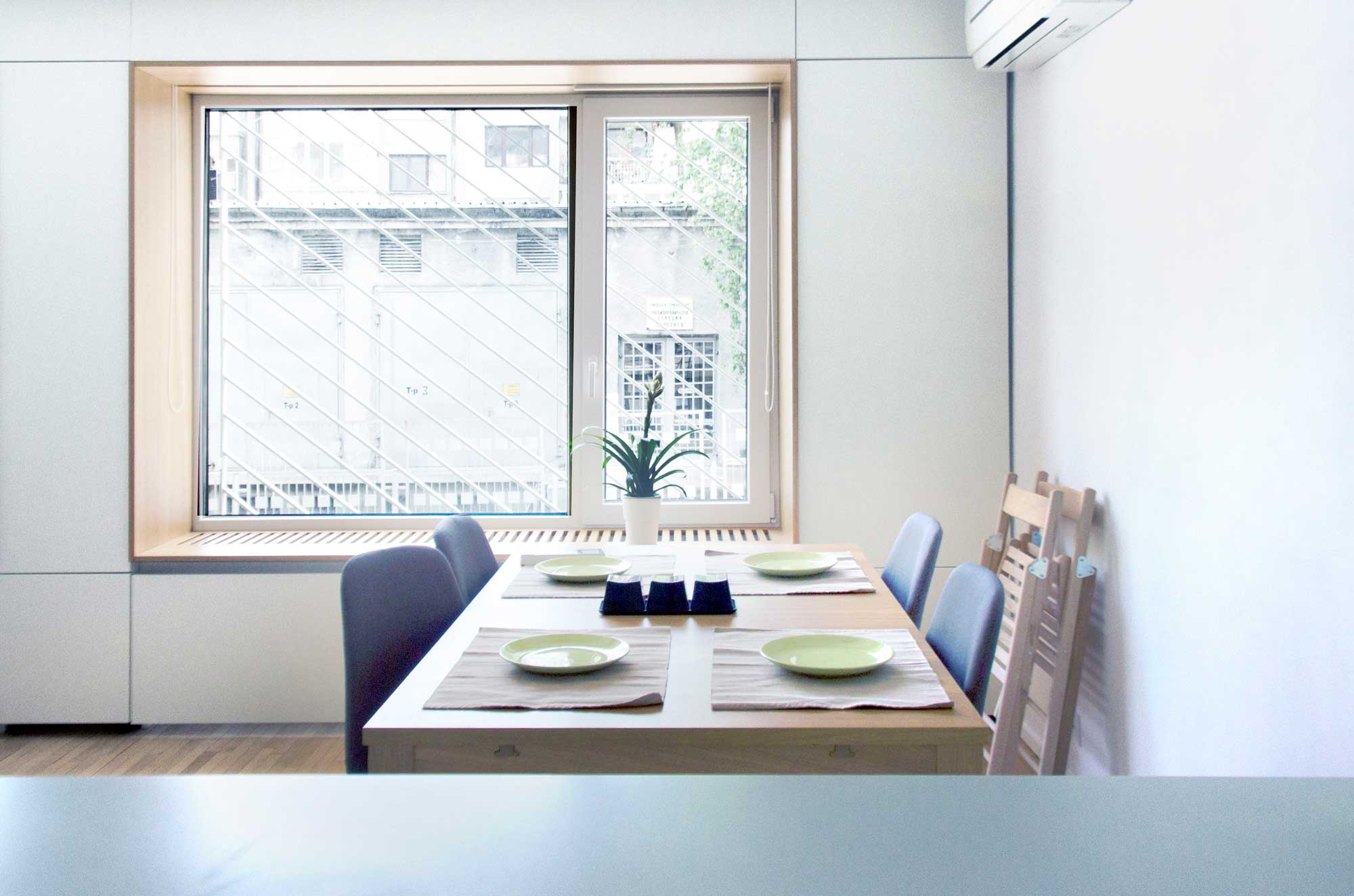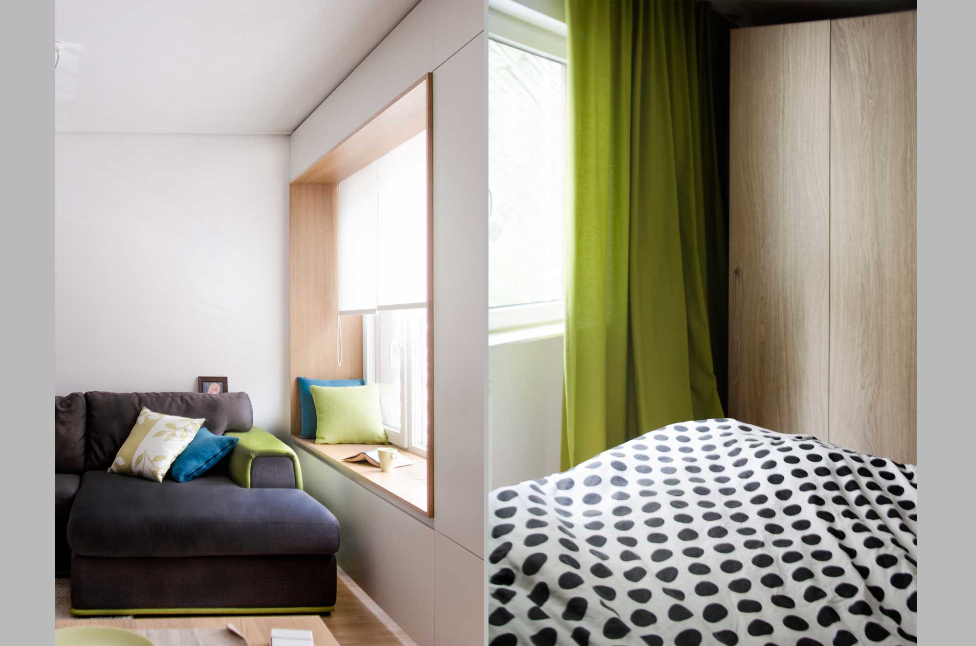 Прозорците печелят вниманието ни веднага – неуютната гледка навън, както и ниския парапет, предизвикали да се случи нещо предразполагащо и привлекателно. Предвидена е стена от шкафове, която да обрамчи прозорците, образувайки две уютни ниши за сядане – за четене или за гости, за които трапезарните столове не са достатъчни. Така другото изискване на собствениците е удовлетворено – да може да се играят поне две бордови игри едновременно. В шкафа са вградени също така радиаторите и щорите, което придава минимален и изчистен вид на пространството. Останало и много място за съхранение на вещи.