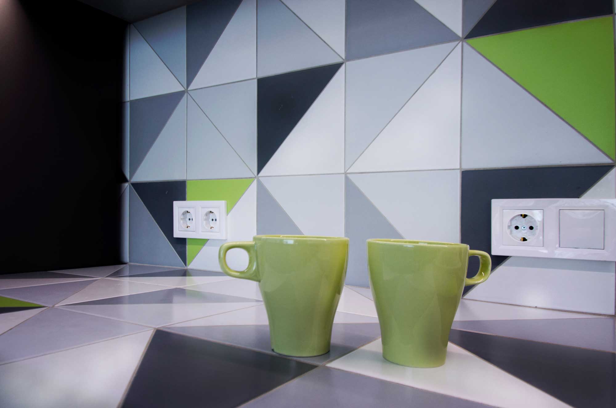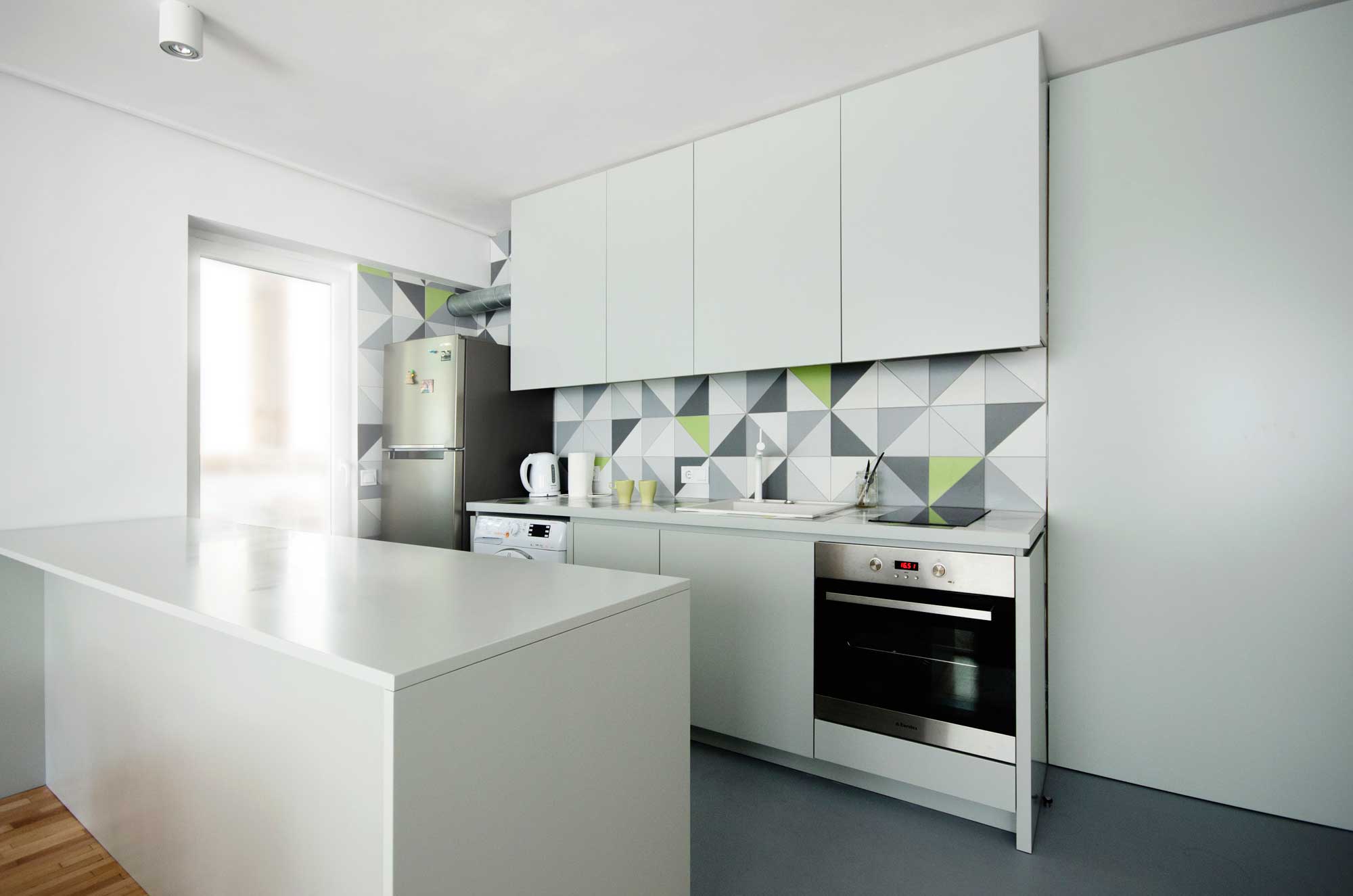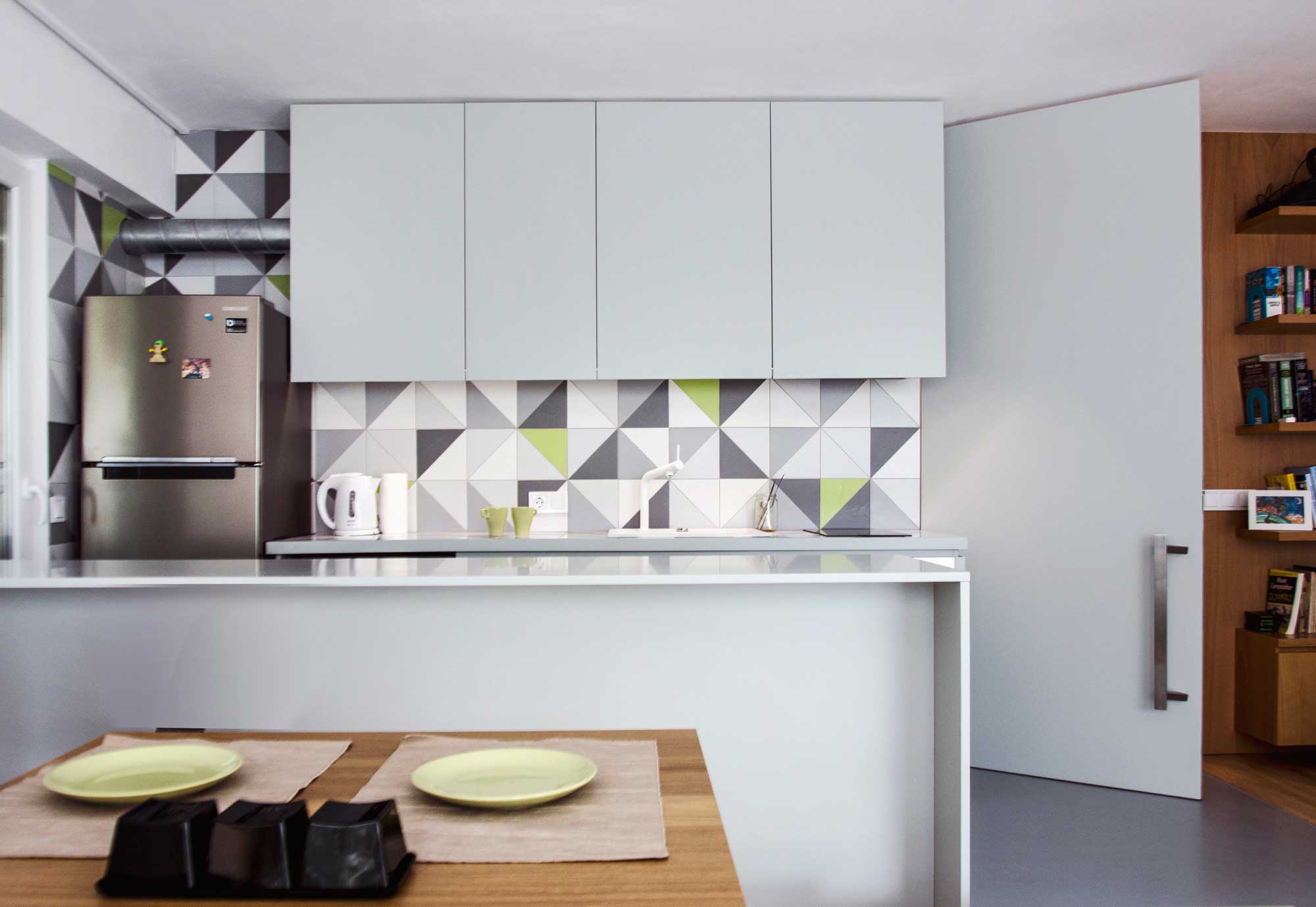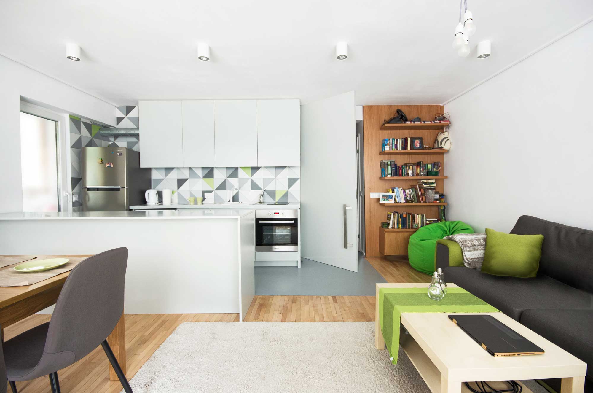 Срещуположната стена пък приютява останалите мебели – кухненските шкафове и библиотеката. Тук желанието на собствениците е да се направи малка и практична кухня – за хора, които в натовареното си ежедневие готвят малко. Проектираната кухня е монохромни шкафове и е доста изчистена и минималистична. Забелязахте ли едноцветните плочки, нарязани и подредени в специфичен мотив? Намираме и търсените зелени акценти. Имаме островът със средна височина – това удвоява площта за готвене и служи и за неформален бар при посрещане на гости. С него количеството на едновременно играни бордови игри нараства на три. Удовлетворено е изискването за голям и удобен диван с функция за сън. Осветлението на дневната е обособено в няколко отделни кръга.