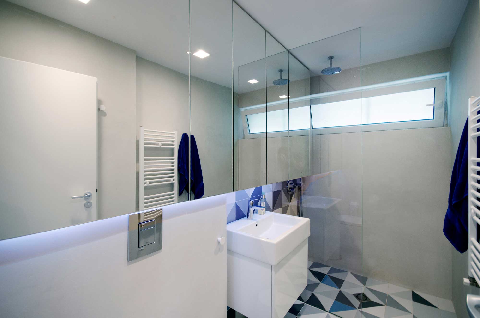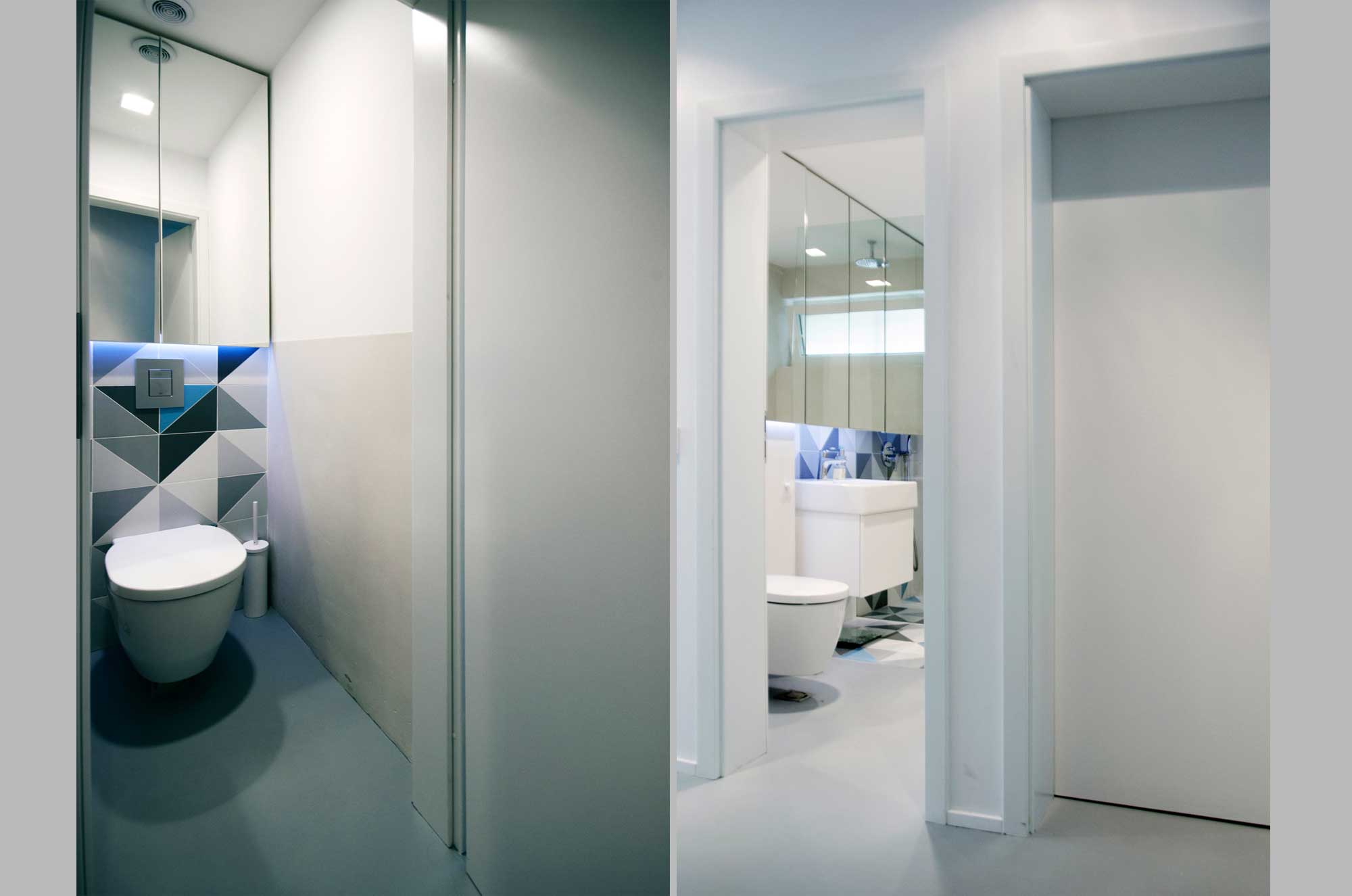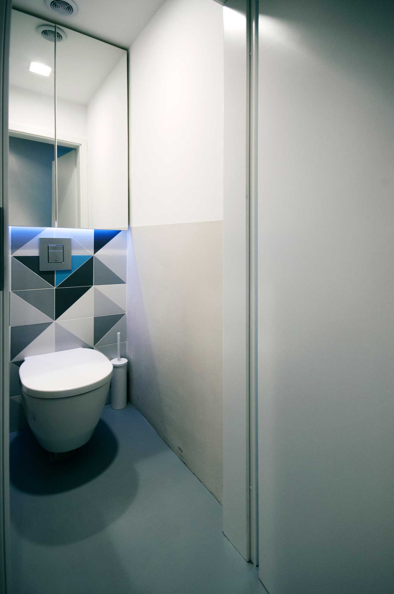 Кабинетът е най-малкото помещение в жилището, а и това, в която се прекарва най-много време. Памучните бели завеси създават спокойна атмосфера и филтрират естествената светлина. Спалнята също гледа към двора на блока и е относително тъмна. Акцентът тук са тревнозелените завеси, в хармония със зеленината пред прозореца. Санитарните помещения на този малък апартамент сa като преродени – на лице имаме ахроматични цветове със сини акценти – за свежест и спокойствие, сред които човек да посреща и изпраща деня си. Комбинирано е микроциментово покритие по пода и стените с мозайка от плочки, подобна на тази в кухнята.