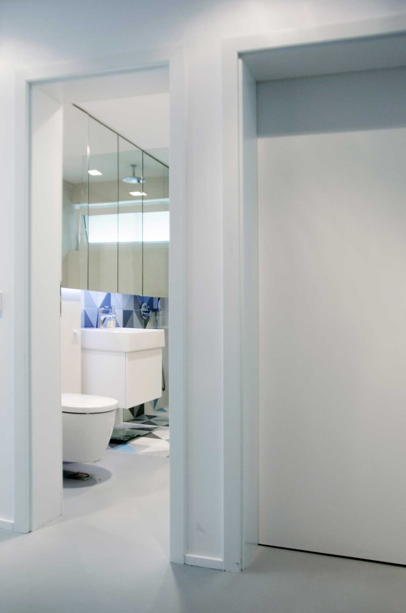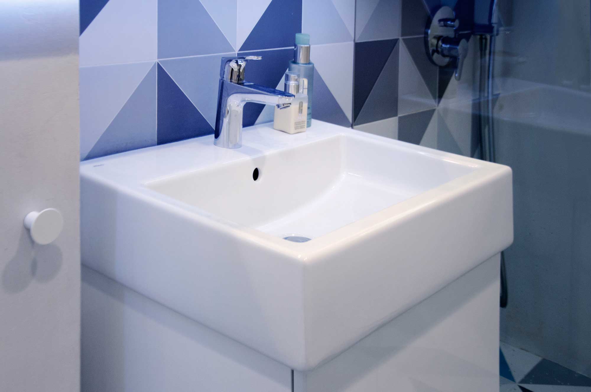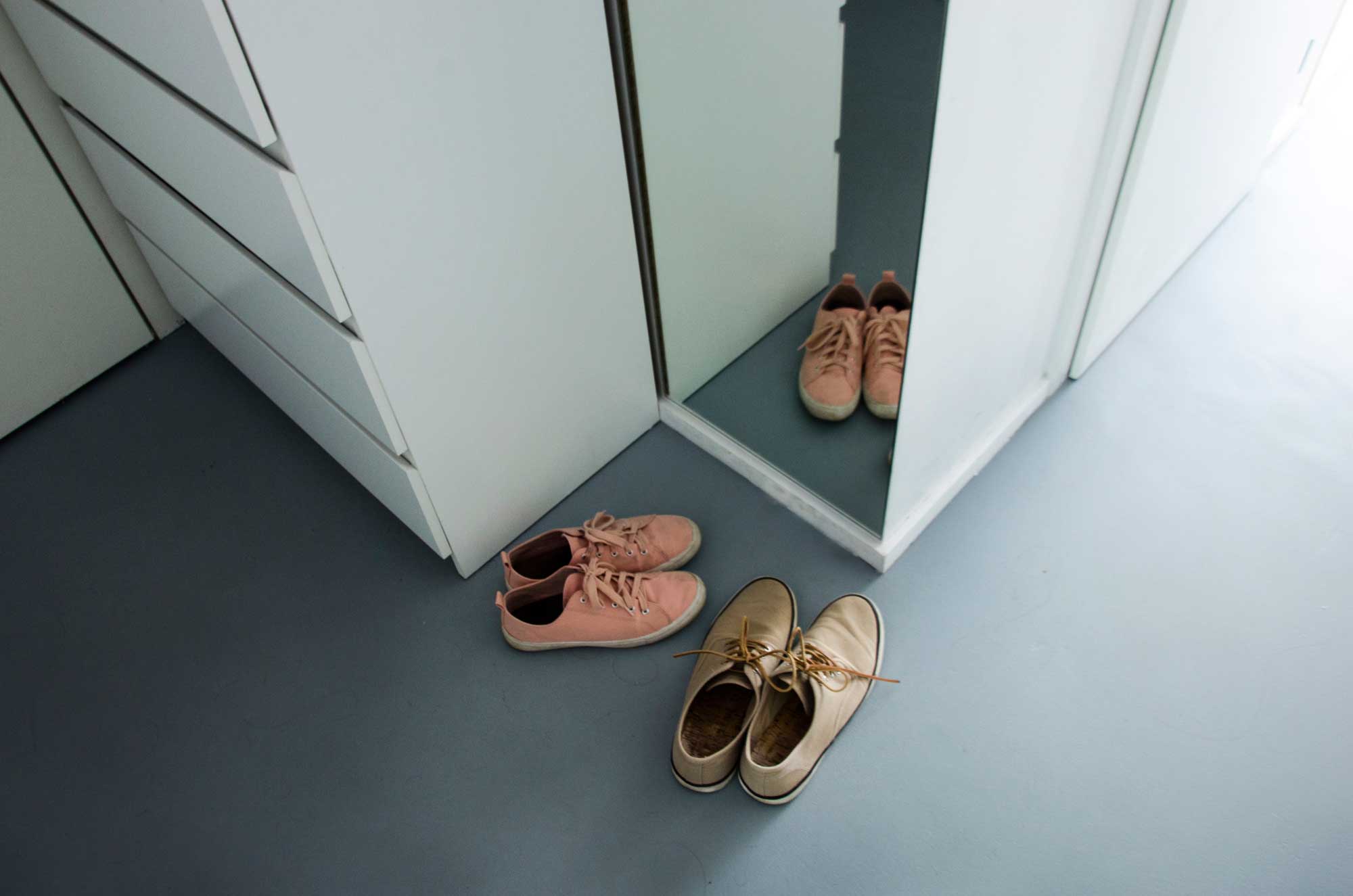 Кабинетът е най-малкото помещение в жилището, а и това, в която се прекарва най-много време. Памучните бели завеси създават спокойна атмосфера и филтрират естествената светлина. Спалнята също гледа към двора на блока и е относително тъмна. Акцентът тук са тревнозелените завеси, в хармония със зеленината пред прозореца. Санитарните помещения на този малък апартамент сa като преродени – на лице имаме ахроматични цветове със сини акценти – за свежест и спокойствие, сред които човек да посреща и изпраща деня си. Комбинирано е микроциментово покритие по пода и стените с мозайка от плочки, подобна на тази в кухнята.