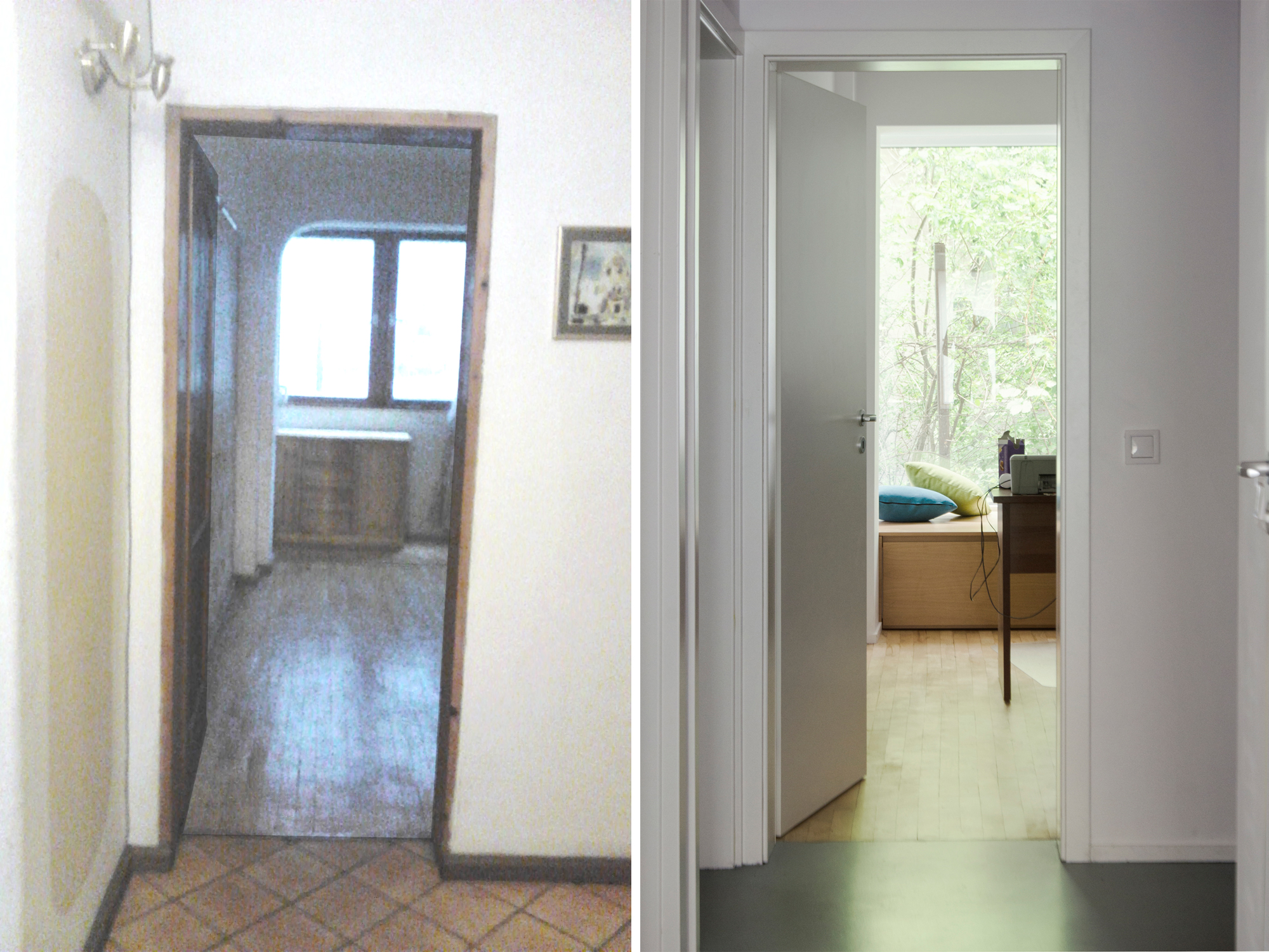 Собствениците дълго търсили подходящото жилище. И след почти две години го намират: маълък апартамент в центърa, с две спални и просторна дневна, плюс баня и тоалетна. Тъй като се намира на първия етаж, това прави помещенията откъм двора малко по-тъмни. Разпределението не е много променено. Коридора и двете санитарни помещения са преработени, за да се получи праволинеен коридор, както и голяма баня с тоалетна. Дневната с кухненския кът, както и голямата спалня, остават непроменени. По-малката спалня е превърната в кабинет. Усвоеното протранство на балкона е тотално променено – снишено е нивото на парапета, а светът обствениците гледат през френски прозорци, които вкарват светлина в тъмната и малка стая.