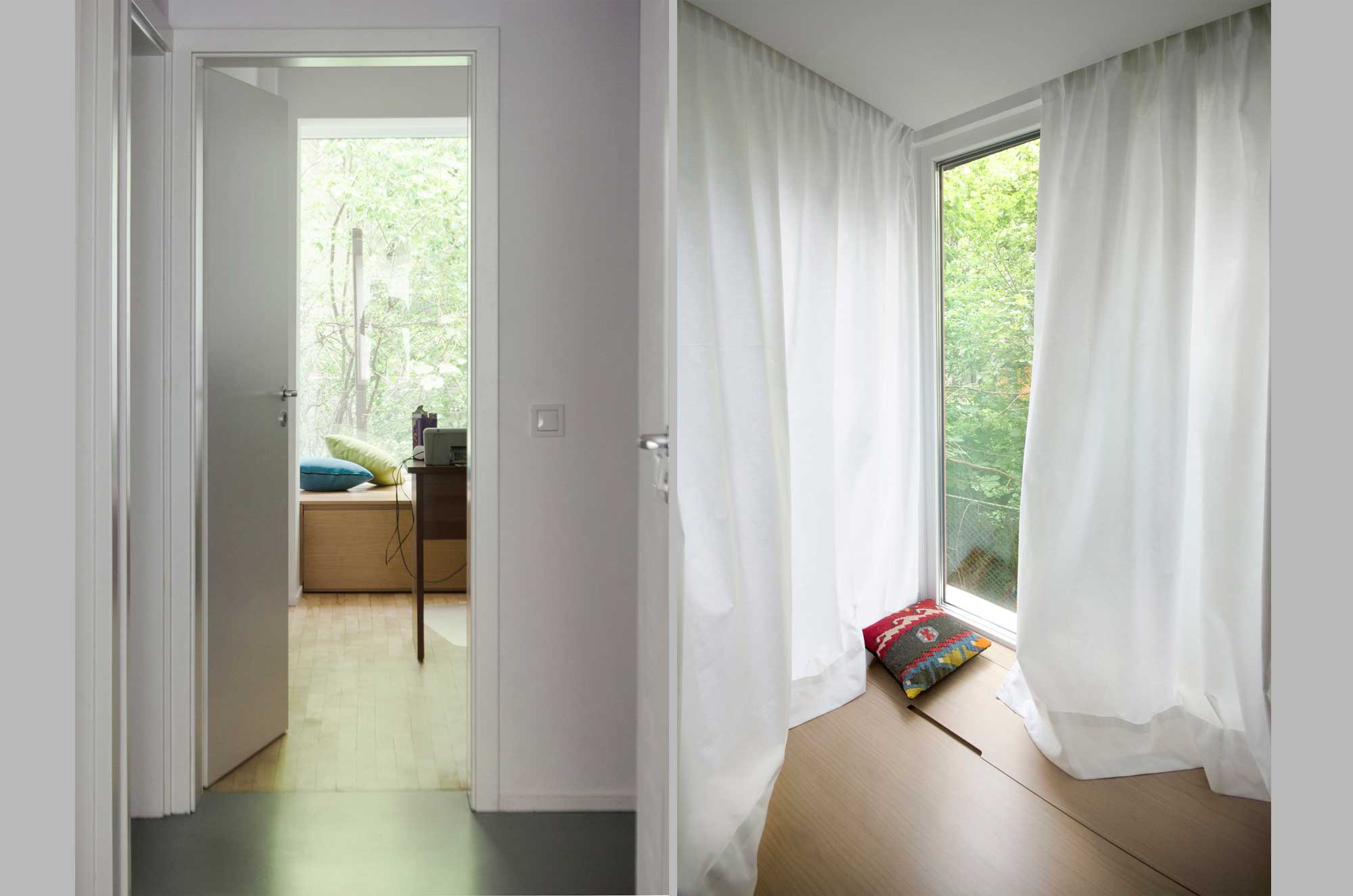 Прозорците печелят вниманието ни веднага – неуютната гледка навън, както и ниския парапет, предизвикали да се случи нещо предразполагащо и привлекателно. Предвидена е стена от шкафове, която да обрамчи прозорците, образувайки две уютни ниши за сядане – за четене или за гости, за които трапезарните столове не са достатъчни. Така другото изискване на собствениците е удовлетворено – да може да се играят поне две бордови игри едновременно. В шкафа са вградени също така радиаторите и щорите, което придава минимален и изчистен вид на пространството. Останало и много място за съхранение на вещи.