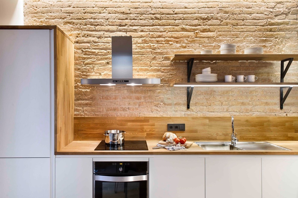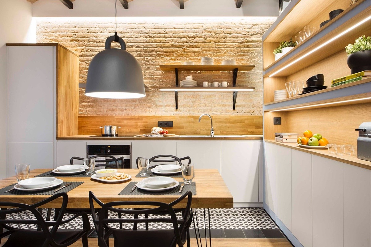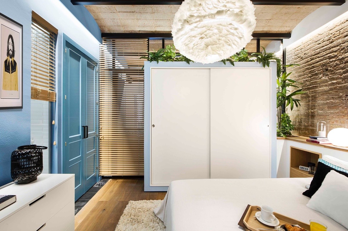 Първата стая е идеално структурирана за двойка. Трапезарията е оградена от линейна кухня, уютна всекидневна и два балкона. Това жизнено пространство съдържа най-много цветове, модели и мебели, за да създаде едно динамично пространство. Черните рамки на прозорците създават плавност между помещенията, свързвайки се с дома, без да са недискретни. Кухнята показва индустриален шик през откритата тухлена стена, която прави чудеса за стаята и я прави малко по-интересна. Дървените елементи в стаята, подобно на пода и тавана, изглеждат тропически – тема, която винаги е необходима в лятната къща. Тези широки рафтове са идеални за показване на буйни растения и чаши за вино. Това е начин да се спести място и е толкова декоративно, колкото и полезно. От този ъгъл можем да видим доколко всички аспекти на помещението са свързани помежду си, за да направим една сплотена и добре оформена картина. Монтираните рафтове са от съществено значение за запазване на пространството. Те са стилни и практични – най-бързият начин да спестите място във всяка стая.