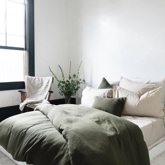 Зеленото е естествен цвят – за да получите малко повече драматизъм, изберете маслиново, смарагдово или маслено зелено. Комбинациите от текстури са най-добри, а и можете да създавате смел контраст с бяло. Кадифето е добре дошло, меко, удобно и топло. Плюс това е последният хит при младоженците. Тези нюанси на зелено се комбинират отлично с топло сиво.