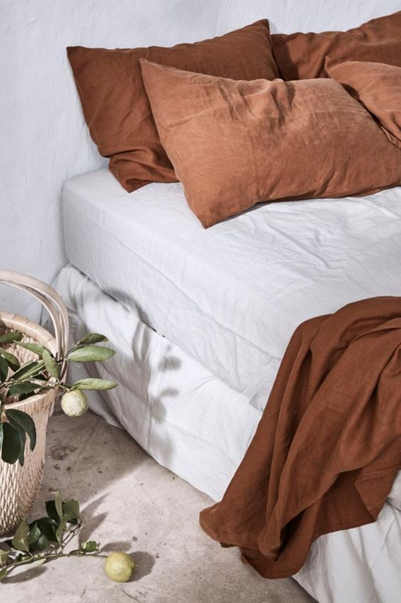 Това е другият популярен есенен цвят, но ако ви идва прекалено смел, изберете по-тъмният му вариант. Можете да изберете само одеяло, няколко възглавници или кувертюр в този цвят – ще се комбинира прекрасно с бяло. Можете и да смените изцяло спалният комплект в цвят карамелизиран портокал, което създава страшно топло усещане и е адски модерно в момента. Карамеленият портокалов цвят изглежда страхотно и смело в контраст с бяло. Можете да добавите акценти в топли цветове, щампи и различни принтове, всякакви фигурални пътечки са добре дошли.