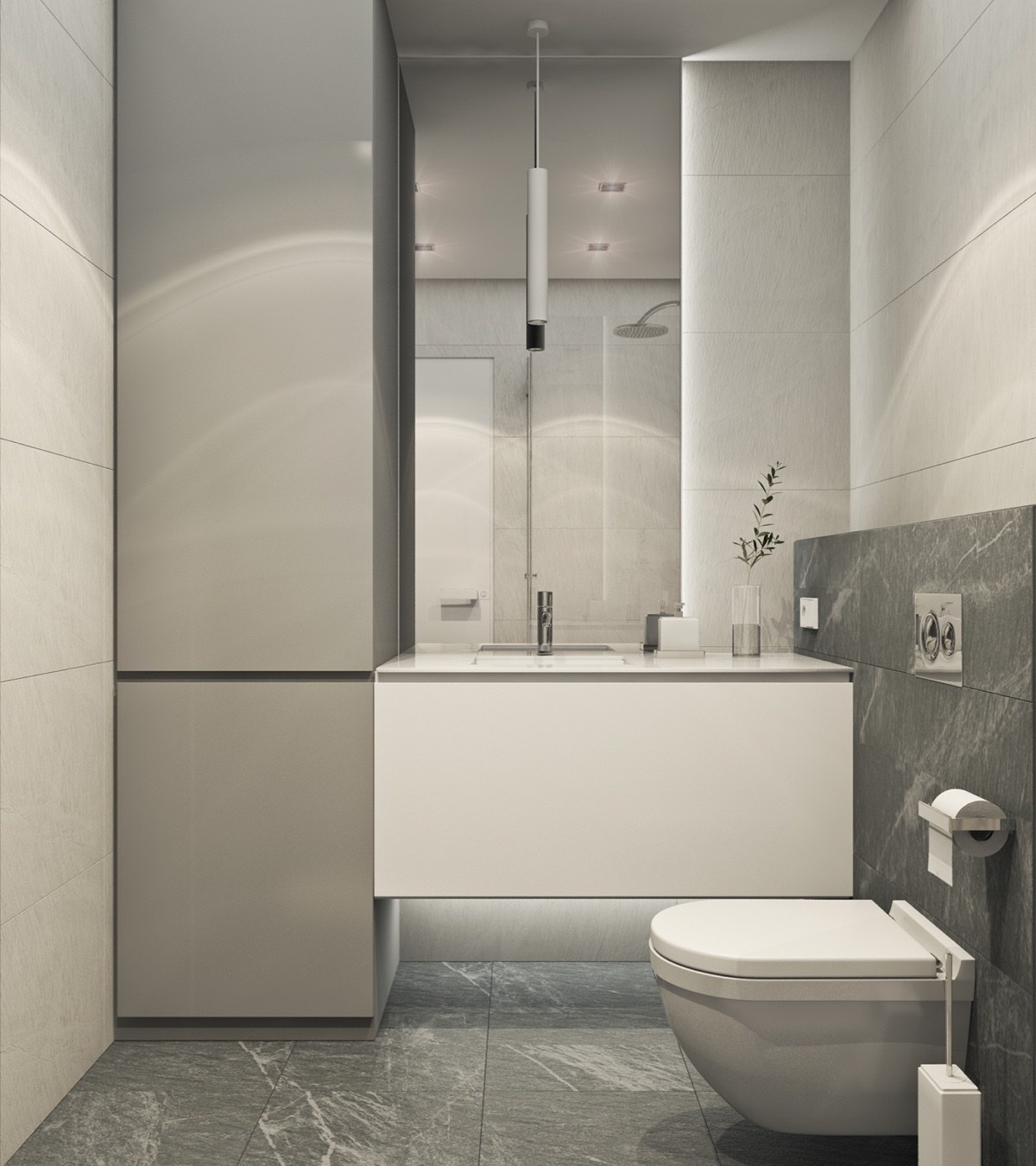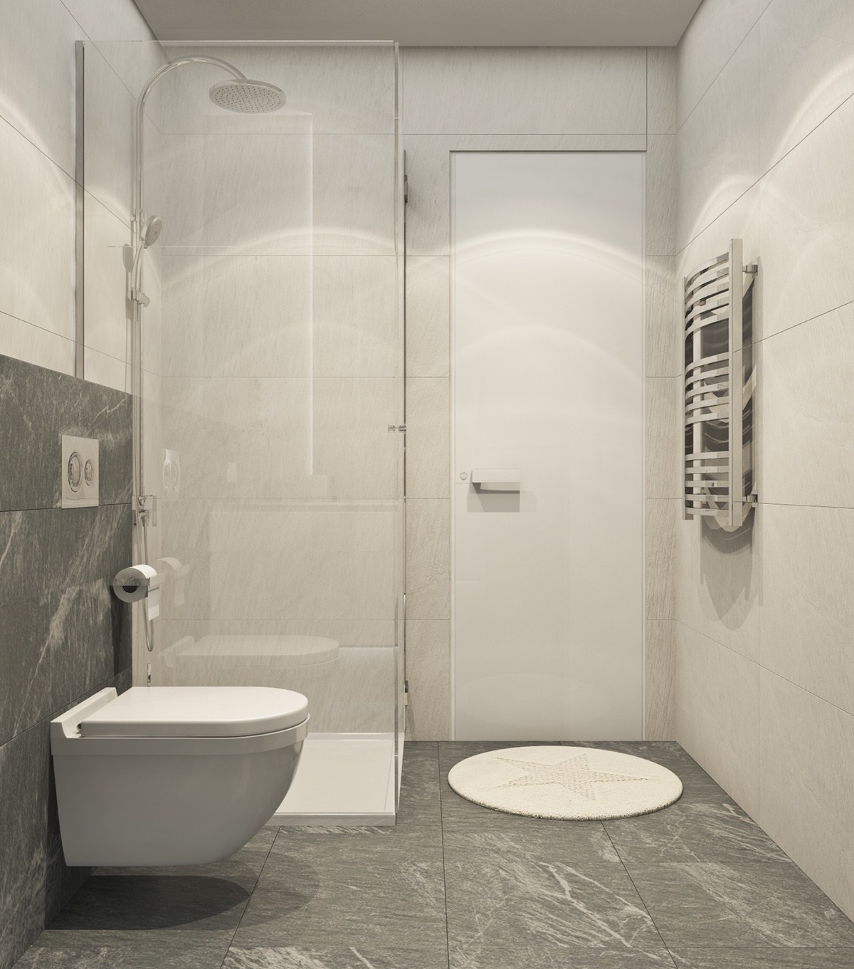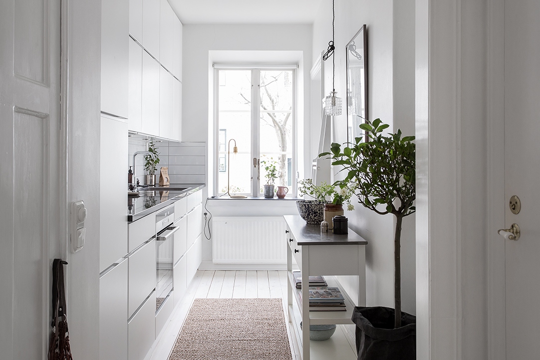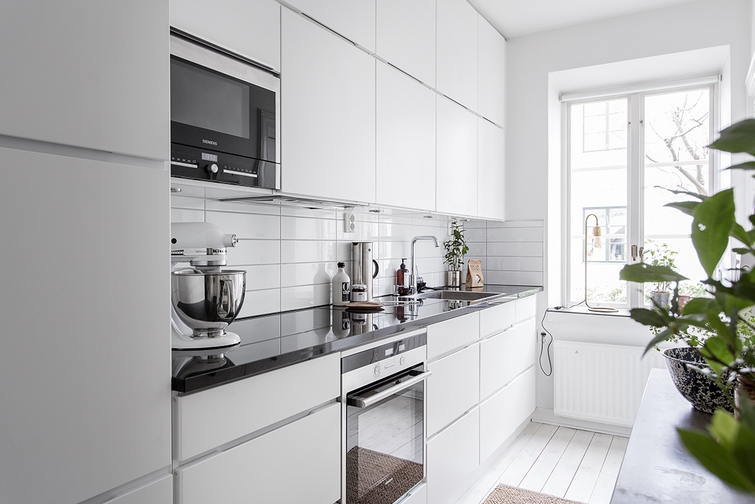 Този апартамент с една спалня използва пространството разумно и без компромиси, когато става въпрос за стил. А белият фон поддържа тази дневна светла и просторна. Oт пода до тавана геометрично пано от желязо подчертава височината на тавана.