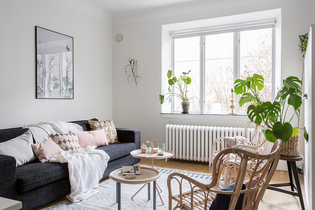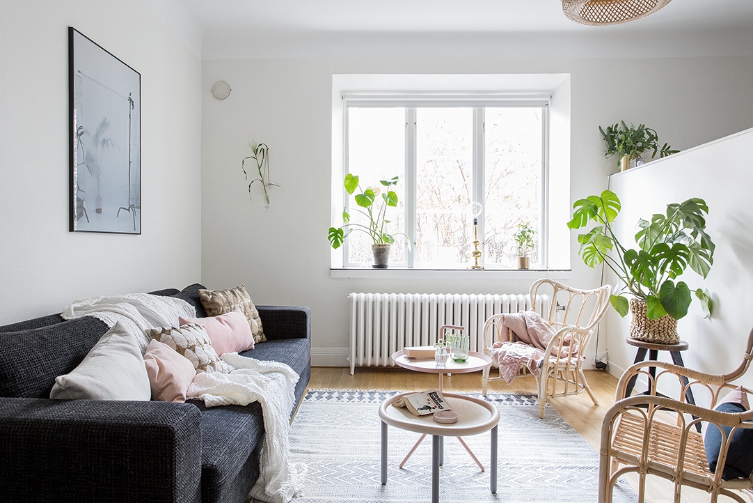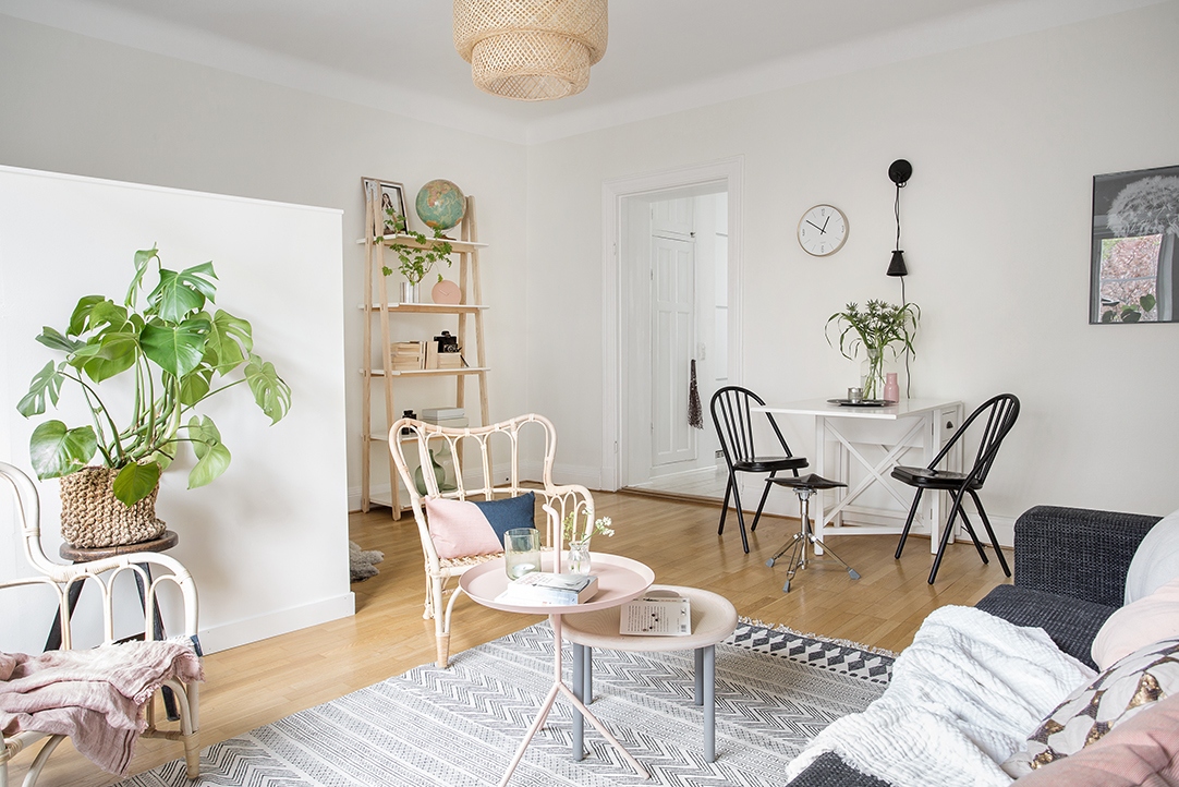 Това студио в шаби шик стил използва еклектичен микс от мебели, зеленина, и различни изделия от текстил. Бюро отляво осигурява място, където да свършите малко работа или да се нахраните.