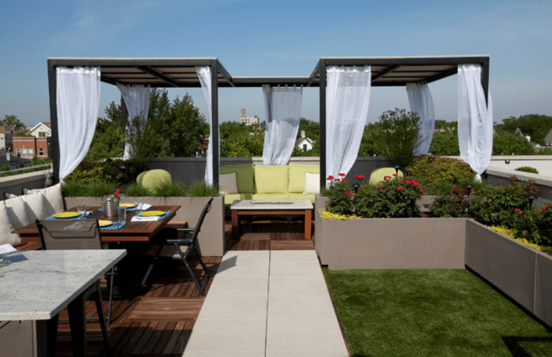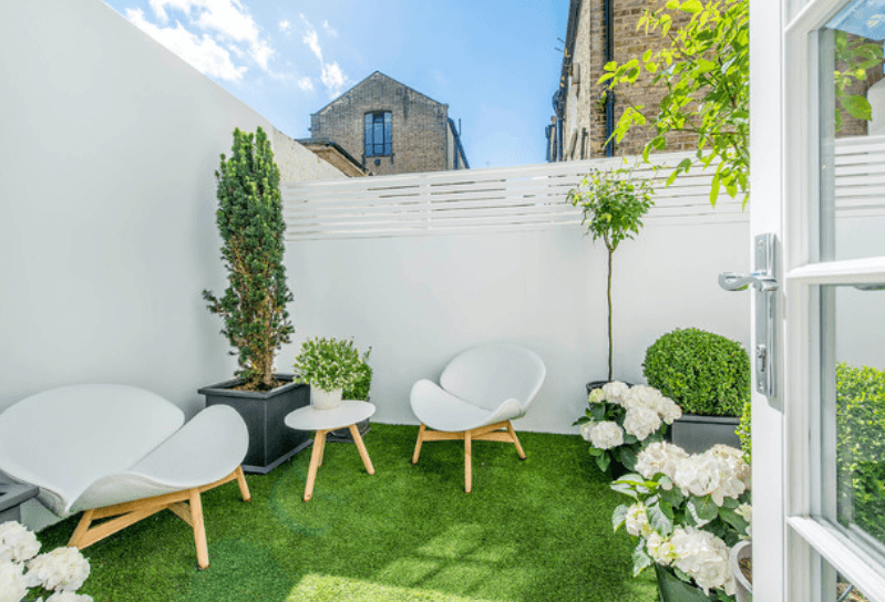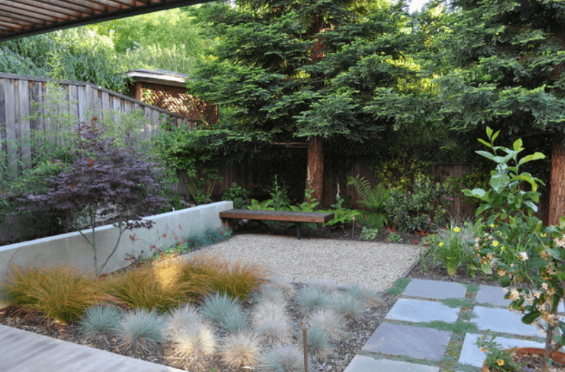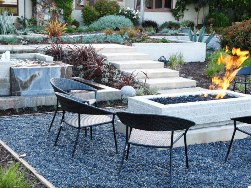 Изкуствената трева изглежда по-реална от всякога, но с добавянето на чакъл, камъни и павета, градината придобива съвременен, минималистичен вид. Тя все още не изиксва поддръжка (изисква нулево количество вода) и е чудесен контрапункт на сукулента и мястото за палене на огън.