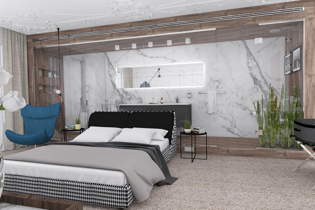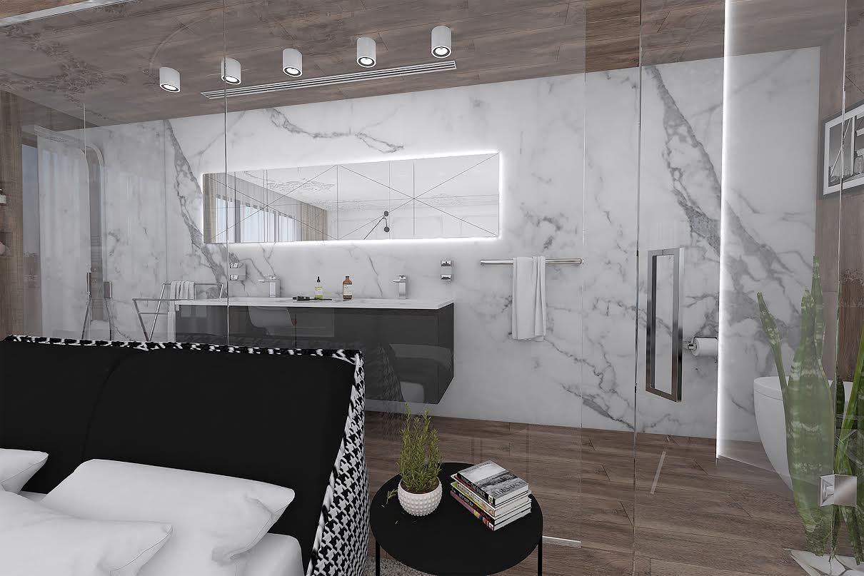 Банята е обособена по една от дължините на стаята. Дървесен декор и бял мрамор са гранитогресите, с които е “облечена” банята. Цялата стена на банята към спалнята е изработена от стъклени панели, за малко дискретност до тоалетната чиния дизайнерите са поставили растителност, която деликатно скрива тази зона. Двойна мивка, голямо огледало с подсветка и кубична фризовка са детайлите, които изпъкват на мраморната стена. Същата фризовка с кубични форми са поставили и на огледалото в спалнята.