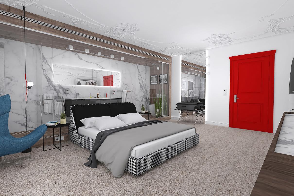 Легло, облечено с актуалният Пепита текстил, синьо кресло с модерна визия, стъклен гардероб и скрин от MDF с мраморен плот – това са мебелите които заемат основната част от спалнотопространство. Главна роля тук играе червената врата. Силен, динамичен цвят, който откриваме в седалката на стола и едно от осветителните тела. Скринът е предвиден да бъде изработен от MDF, кракът към бюрото е закалено 10мм. стъкло, същото ще се използва и за гардероба. Съчетани са класически декоративни елементи по стената и тавана с модерни и изчистени мебели. Резултатът е зашеметяващ – еклектика, която забавлява и интригува.