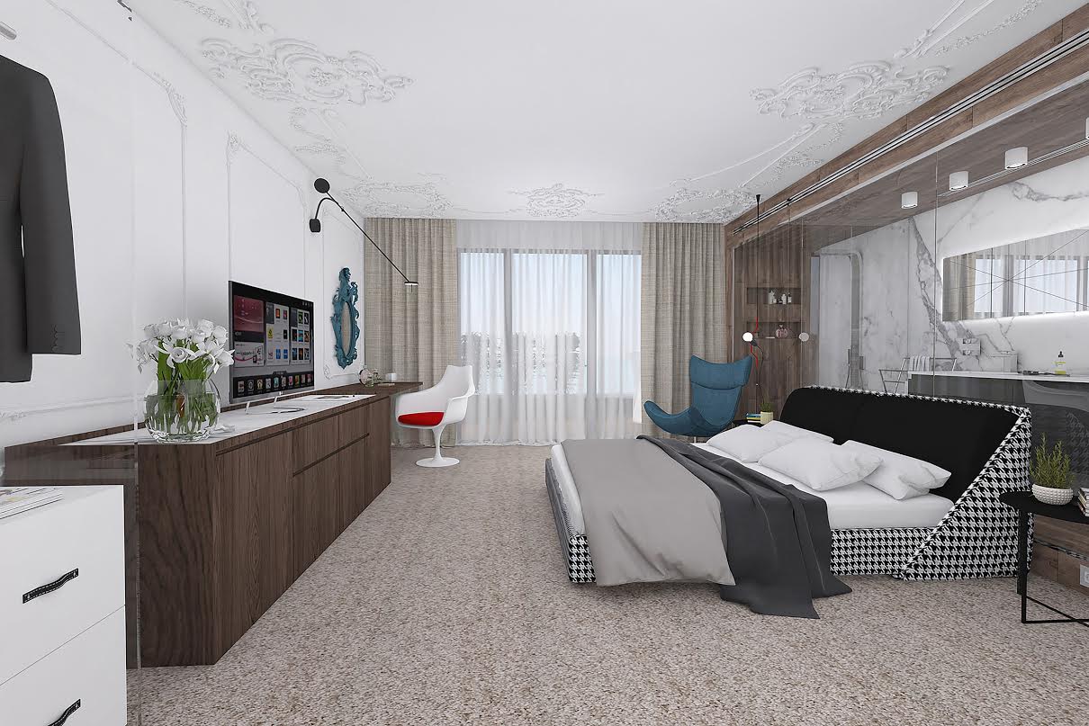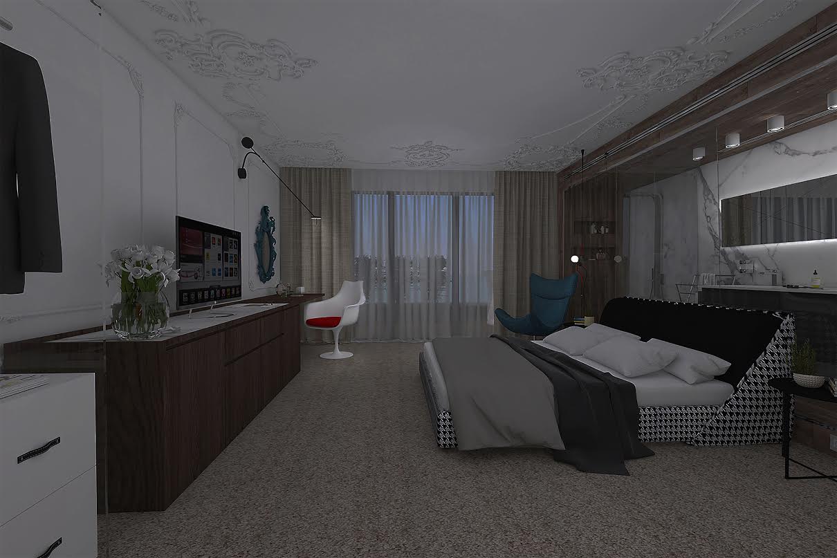 Идеята за създаване на комфортна хотелска стая, но не традиционна, а динамична и зареждаща с енергия, е реализирана. Дизайнерите внасят лукс с класически орнаменти по стените и тавана, уют с помоща на земни тонове на завесите и тавана, както и с помоща на избраните материали, жизнерадостна атмосфера с помоща на цветните акценти.