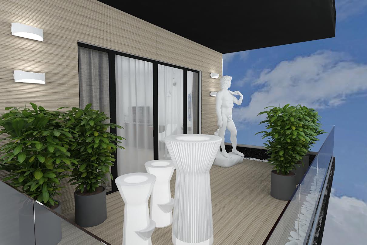 Еклектиката продължава и на терасата. Модерна декинг настилка покрива пода и стената. Стъклен парапет, сет от светещи мебели, бели декоративни камъни и много растителност се “хармонизират” със статуята на голият Давид. Топлият цвят на мокета е пренесен и навън. Тъй като създадената визия на стаята е модерна и съвременна, не можем да пропуснем и модерна автоматизация, която улеснява пребиваването в нея.