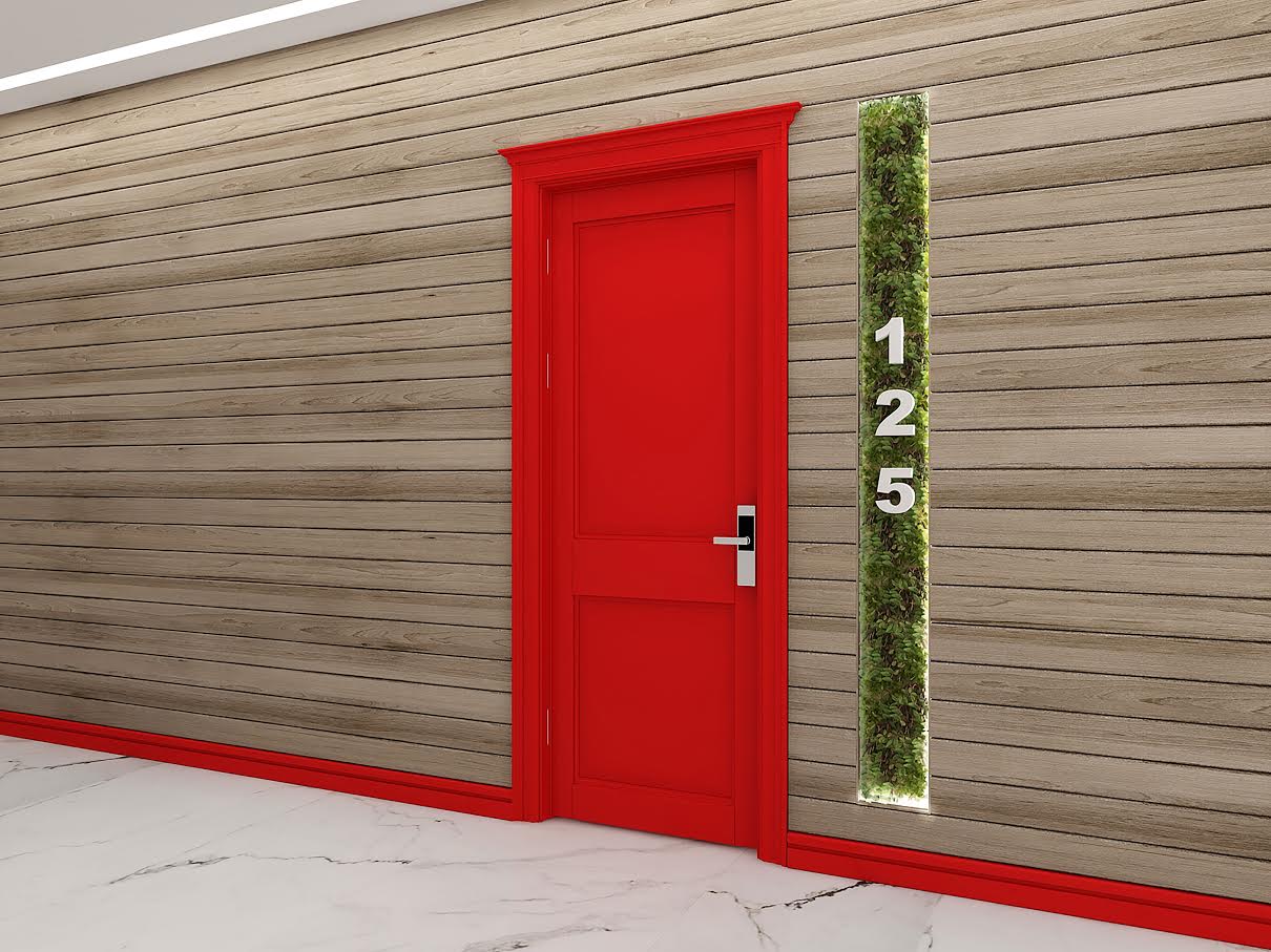 За настилка на пода e използван мокет за повече удобство, стените са оставени бели и декорирани само с релеф. Декоративните елементи по стената и тавана създават луксозна визия на тази хотелска стая. Цветни мебели за акцент, синьо кресло, синьо огледало, стол с червена седална част и червена врата са детайлите, които вдъхват динамика и живот.
