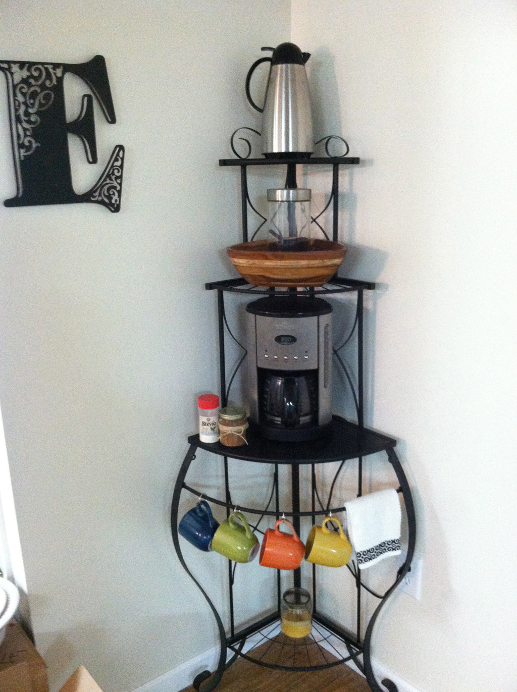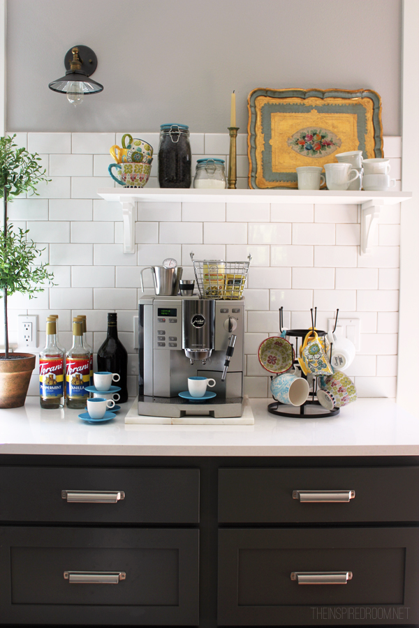 – Рафтове над къта за кафе, за да има повече място на плота. Благодарение на рафтовете, няма да се нуждаете и от голяма количка или маса за кафе принадлежностите.