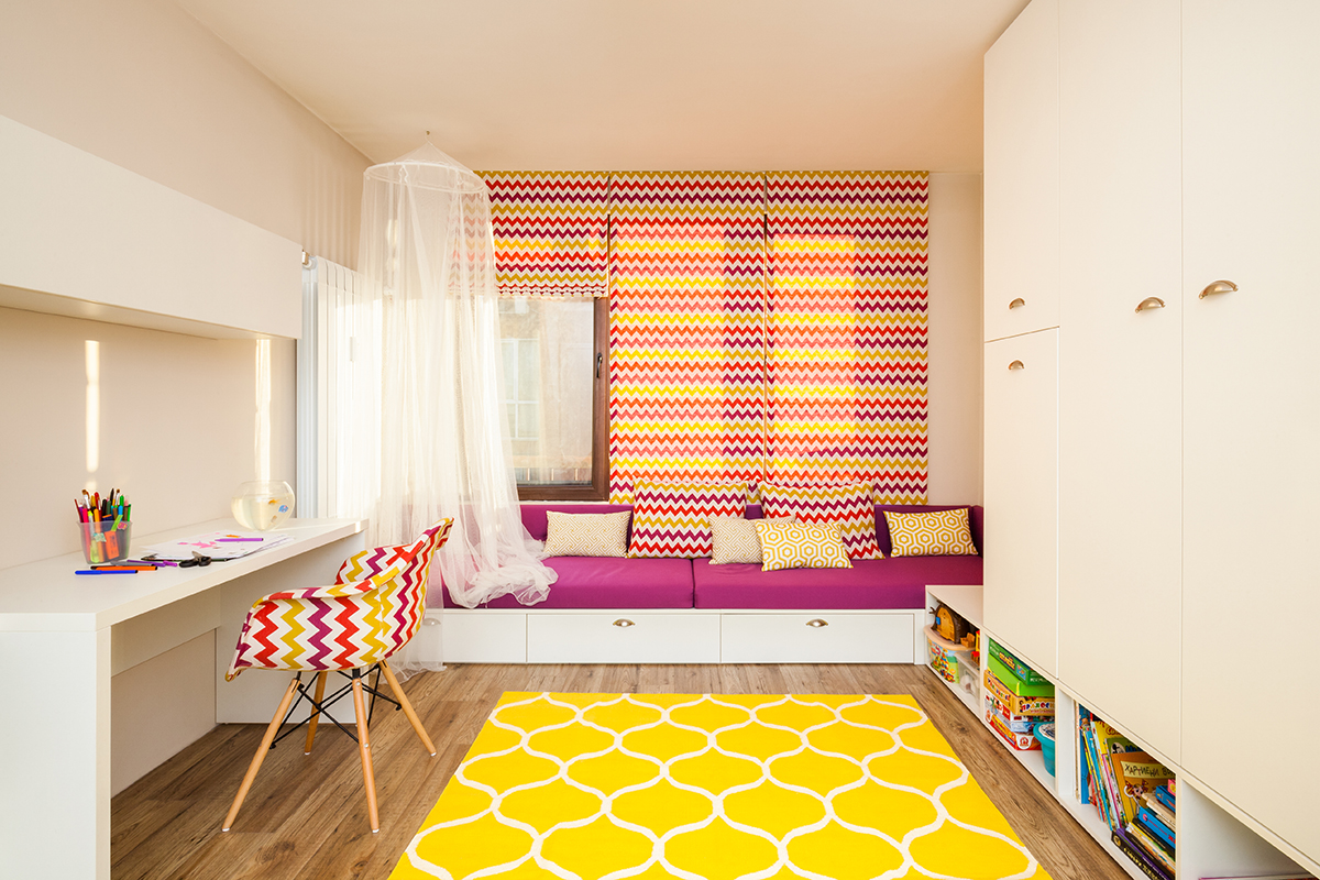В интериорния дизайн на детската стая също има интересни решения, като основния акцент пада върху „миндера“, който е проектиран така, че да комбинира три функции в едно – място, за спане, игра и съхранение. По този начин дизайнерът е успял да осигури достатъчно пространство за игра и възможност за гостуване на други деца. Разбира се и в тази стая цветовете са много свежи, а геометричните фигури са навсякъде.