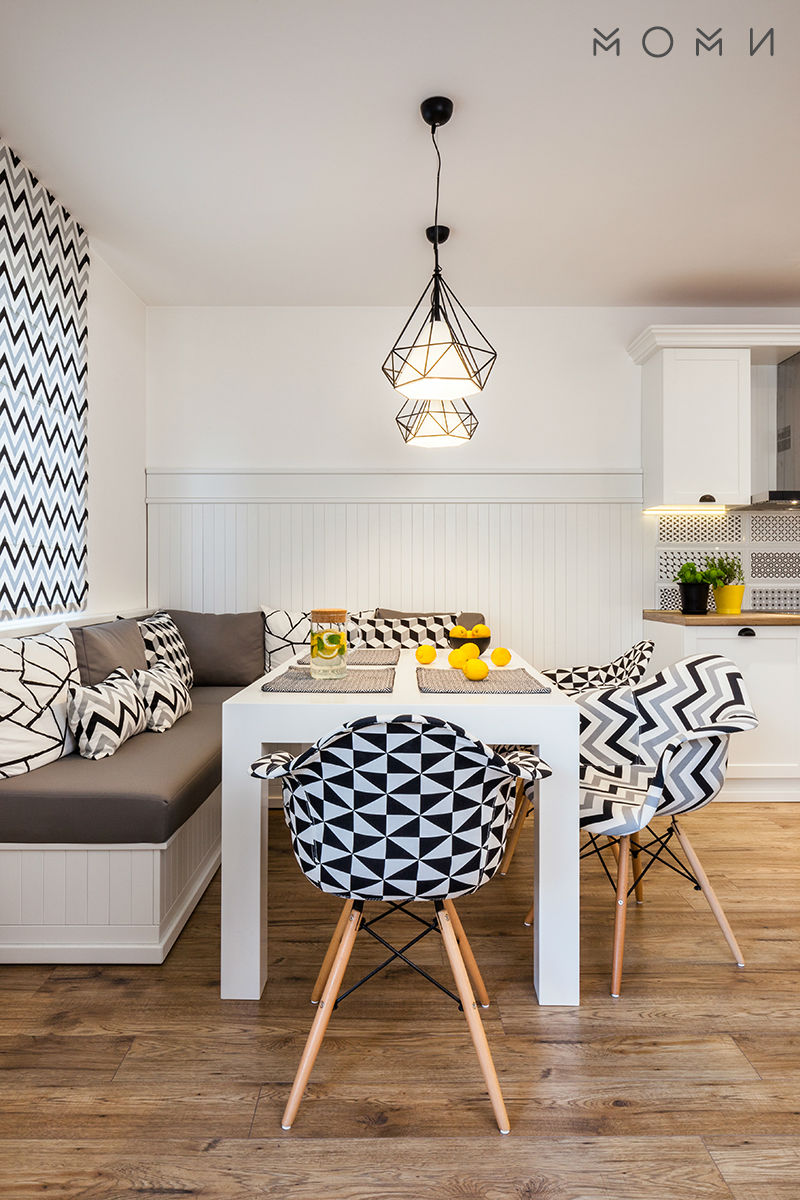 Дневната е с преход към трапезария с кухня, която също има своето нестандартно решение в лицето на кухненския ъгъл за сядане. Двете помещения са изключително стилни в неутрални цветове и скандинавски елементи, като разбира се геометричните елементи са основен акцент в тях. Кухнята е с изчистен дизайн, функционална и бихме казали в изцяло скандинавски стил.