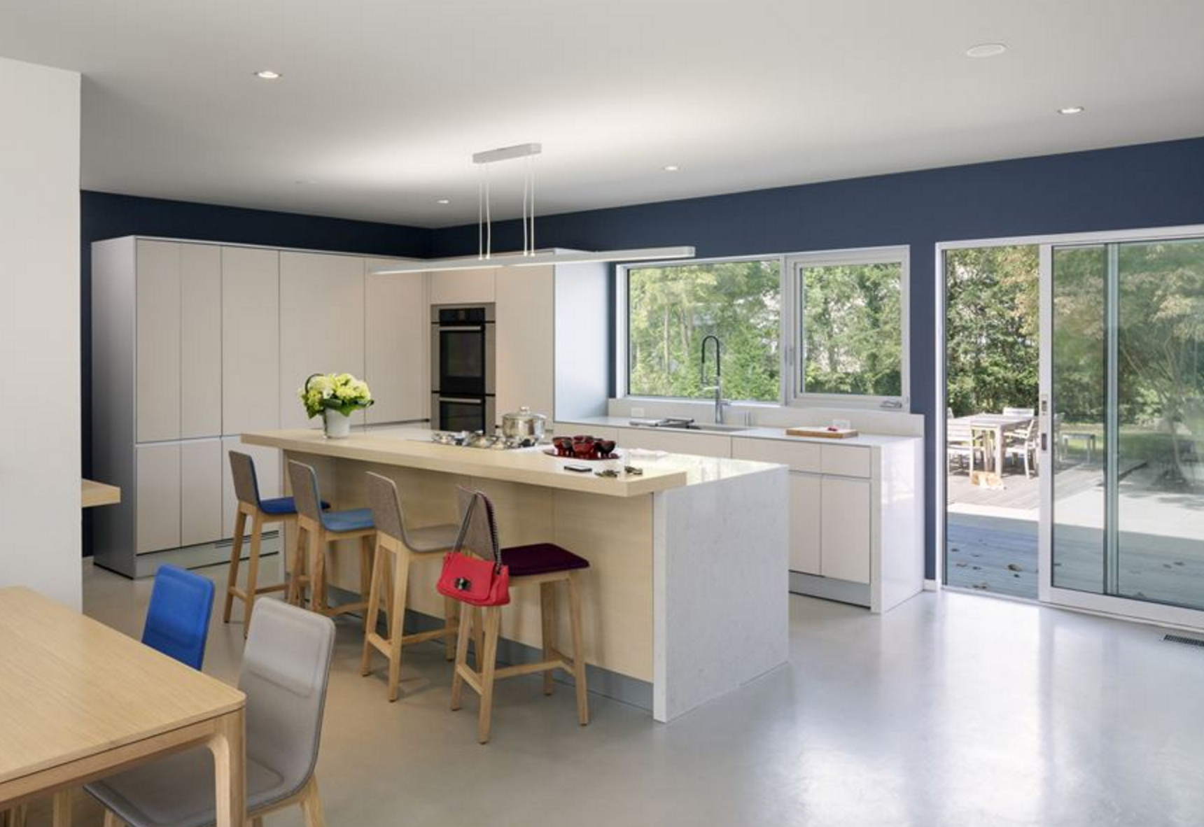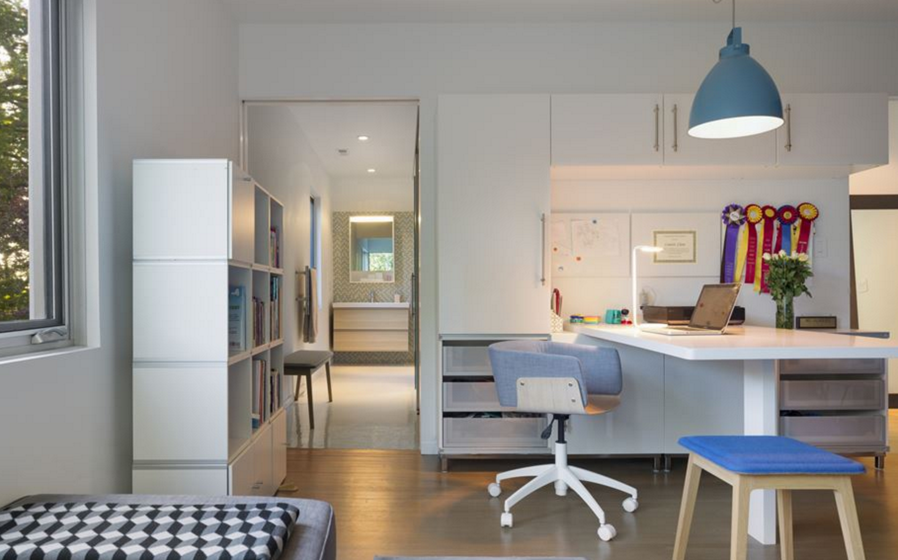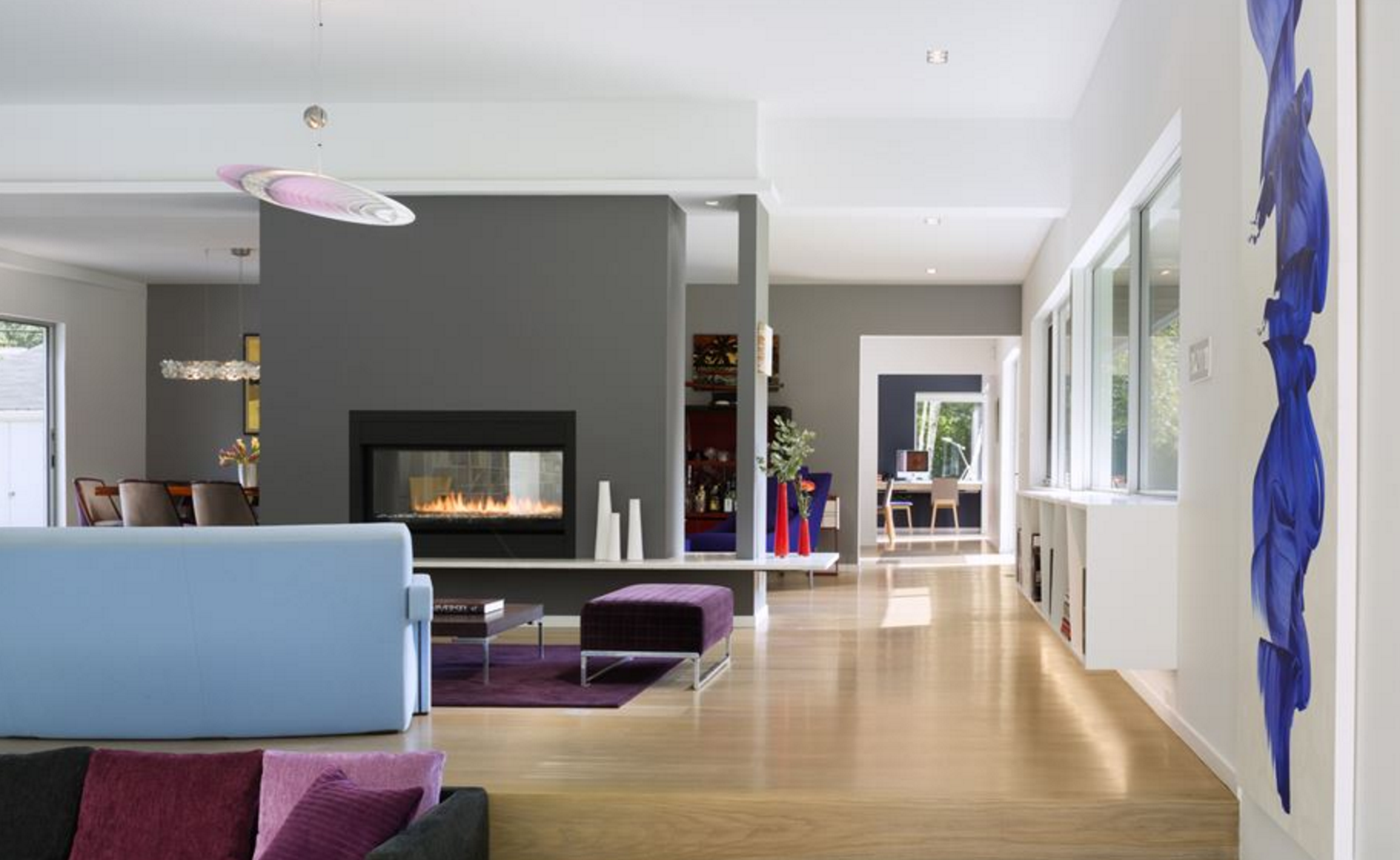 Ъгловите прозорци внасят светлина в стаите, помага за модернизиране на външния вид на къщата. Интериорът на първия етаж включва нова вградена кухня с кът за хранене за всекидневна употреба. Кухнята включва стъклени шкафове, модерни удобства и остров с чекмеджета – за микровълнова печка и охладител за напитки. A черната дъска на стената в дъното се превръща в място за семейни съобщения и художествени изяви от приятели – креативно кътче… Използваните цветове са свежи и приятни за окото. Ние сме особено впечатлени от комбинацията на лилаво и синьо в дневната.