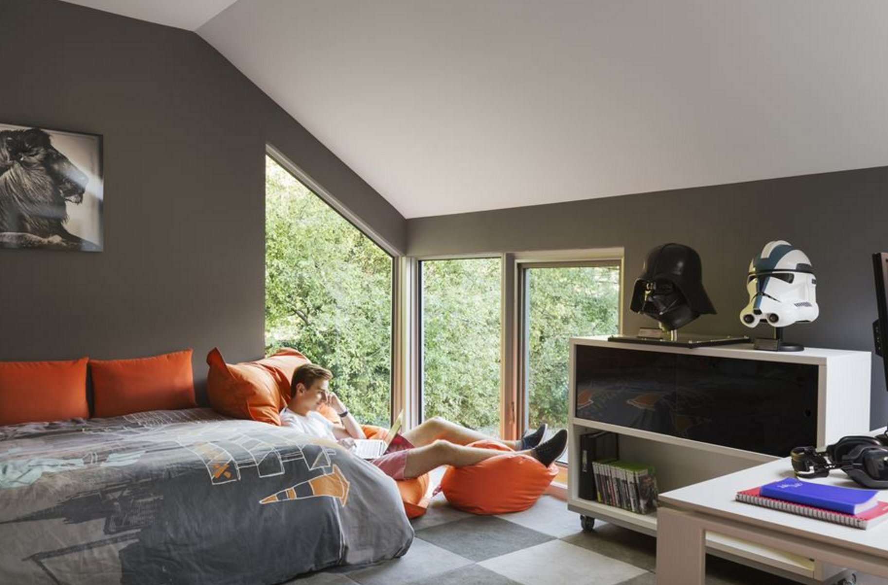 Вторият етаж включва нова спалня за родителите със самостоятелна баня и дрешник. Прозорците на спалнята са с изглед към дърветата. Детските стаи също са били напълно реновирани с нови бани. Дизайнерите са заложили на шкафове IKEA като по този начин разходите са ниски, без да се жертва общото качество и усещането за уют на вътрешните пространства.