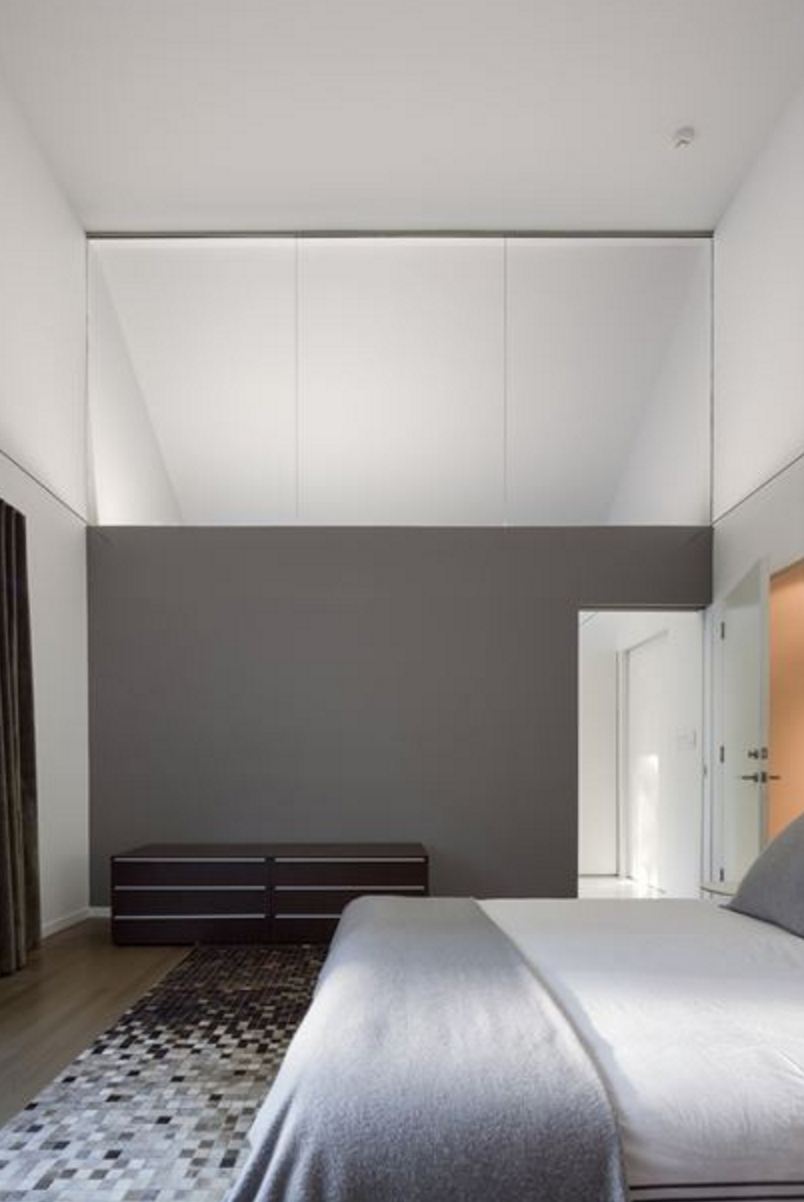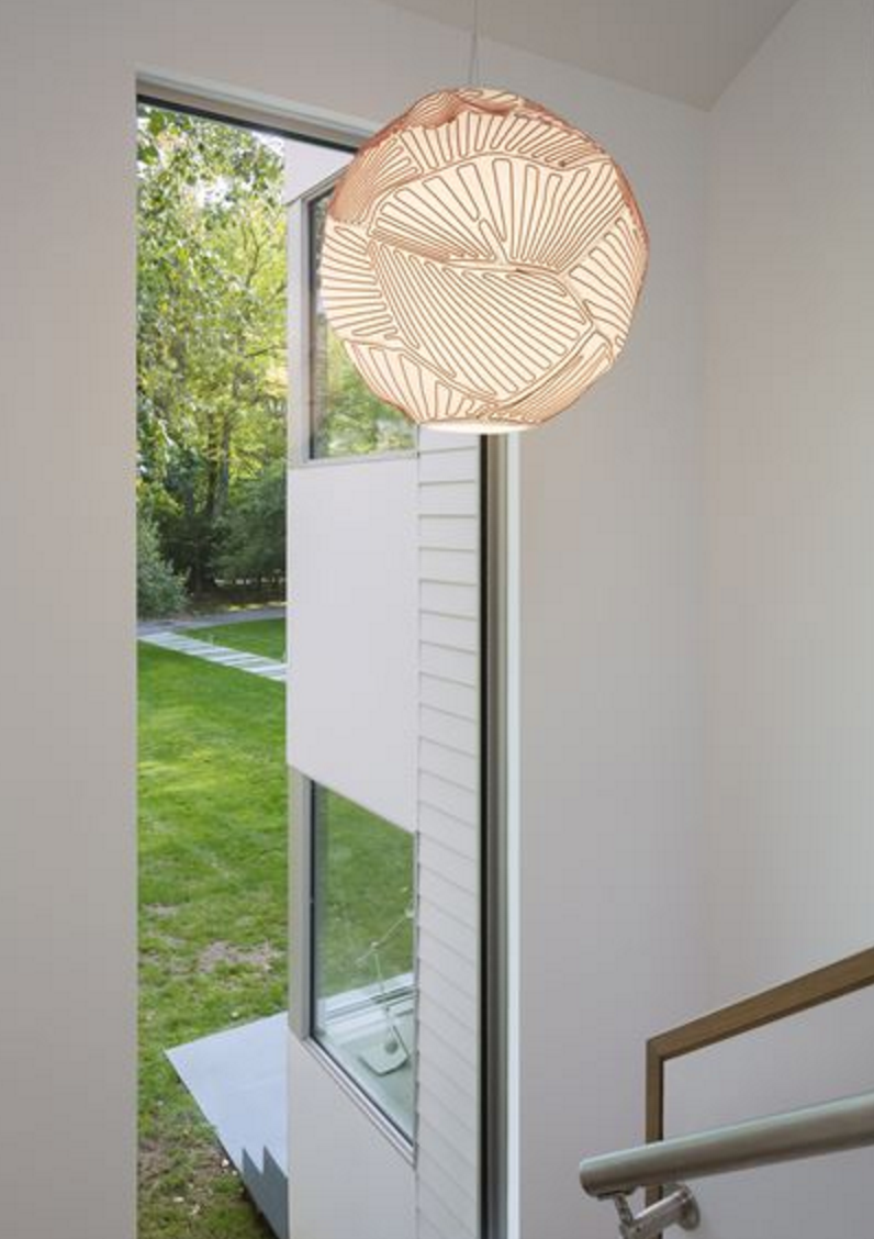 Официалните помещения за хранене и холът са разположени на две нива, като това помага да се “разбие” размера на пространството. Холът е разположен в задната част, за да се даде възможност за лесен достъп до басейна и двора. Наклоненият покрив и високите прозорци отварят гледка към красивите кленови дървета в задния двор. Геометрията на дневната добавя контраст и разнообразие на цялостния дизайн.