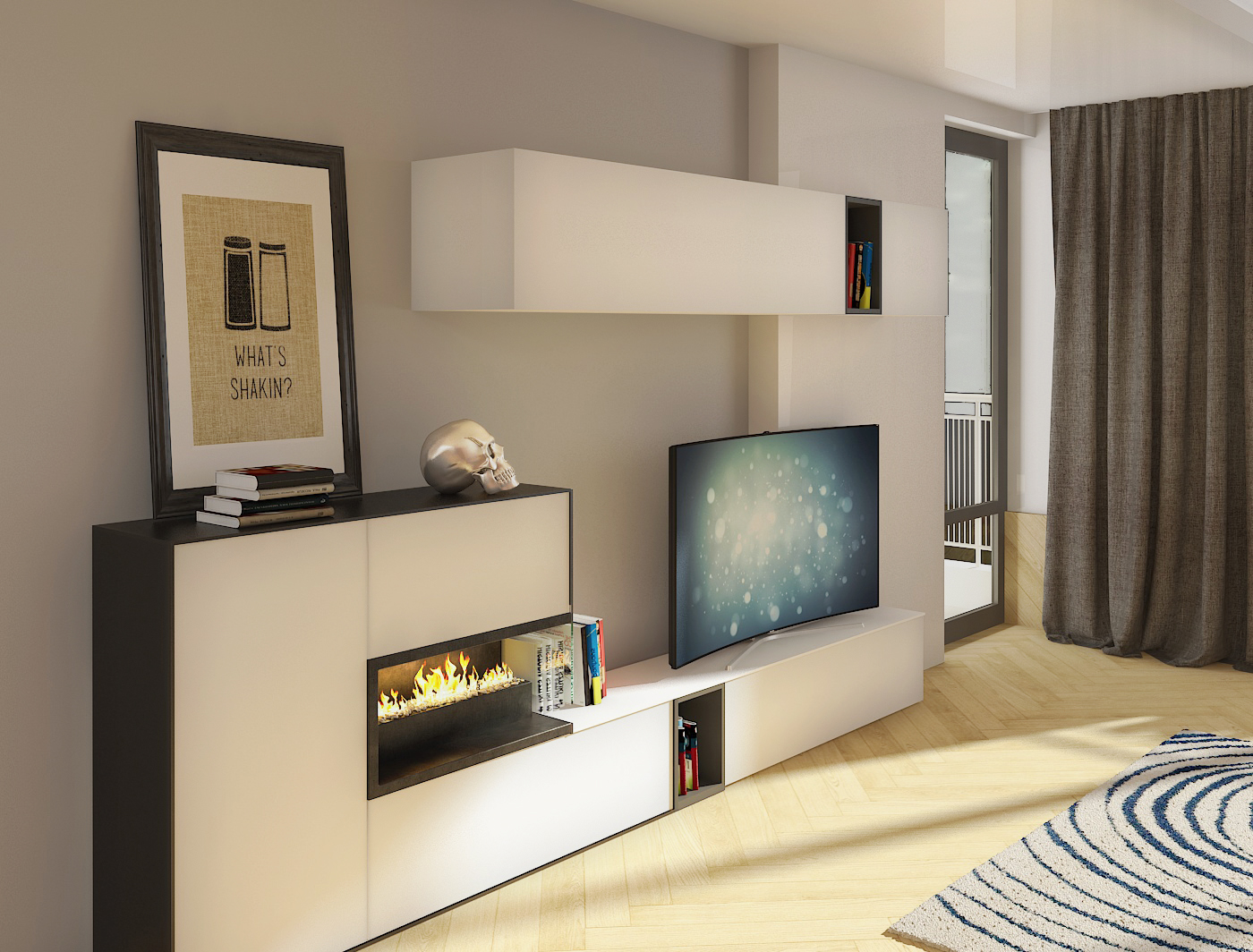 Функционално решение разделянето на дневната с дървена ажурна преграда, като по този начин са обособени две зони – полускрита кухненска зона и зона отдих и хранене. За уюта на апартамента допринася и малката камина на биоетанол, вградена в мебелите.