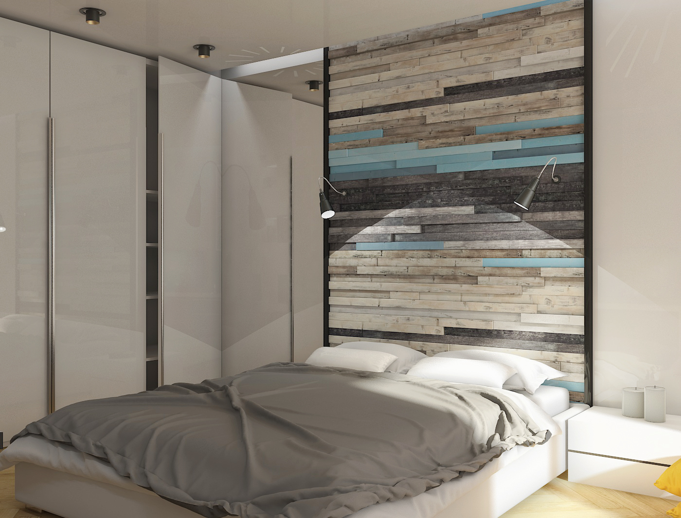 Спалнята е решена в светла палитра с цветни акценти. Гардеробът с плъзгащи врати пести място, а и освен това е много елегантен. Дъбовият паркет и колоритната дървена табла на спалнята внасят топлина и приканват към отдих и почивка. Отново имаме акценти в синьо и жълто, които се комбинират отлично със сиво и бяло.